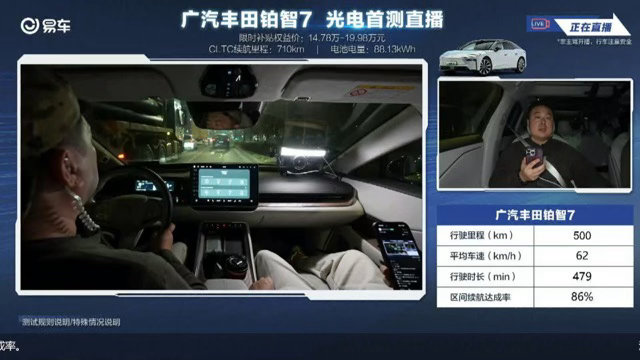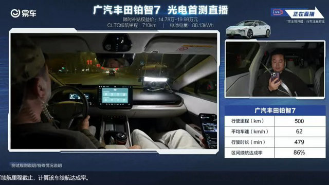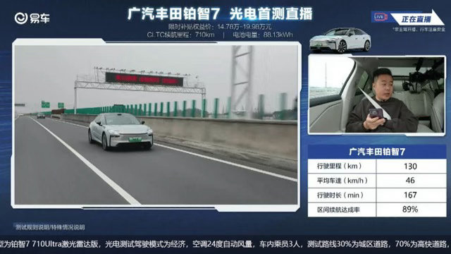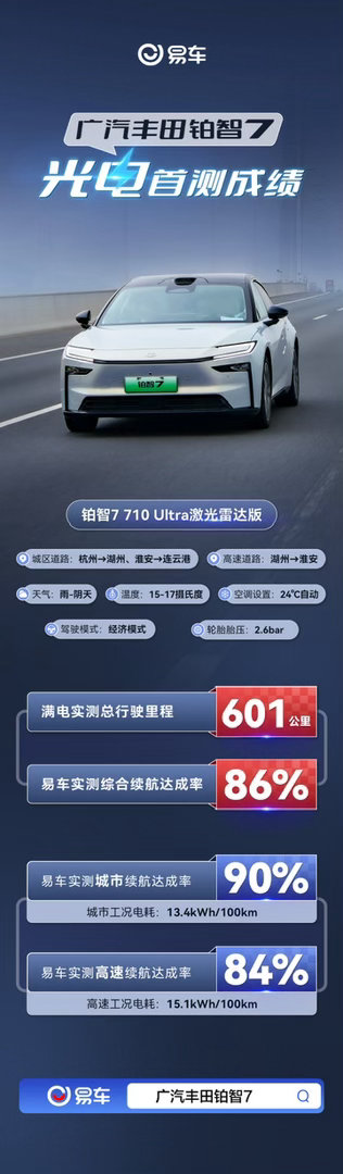刚把铂智7 710Ultra激光雷达版跑了个长途,雨阴天、15-17℃,全程经济模式、24℃自动空调、胎压2.6bar,路况有城市也有高速,给你们报报真实力!满电直接跑了601公里!综合续航达成率86%,这表现真挺稳。市区路况达成率90%,电耗才13.4kWh/100km,堵车代步完全不虚,掉电很慢。高速路况达成率84%,电耗15.1kWh/100km,高速风阻大,这成绩已经很顶了。简单说,这台车标称700多公里续航,实际跨城跑下来,综合86折、市区9折、高速84折,在阴雨天气下还能有这水准,长途基本没焦虑。丰田铂智7全网首次直播测试
