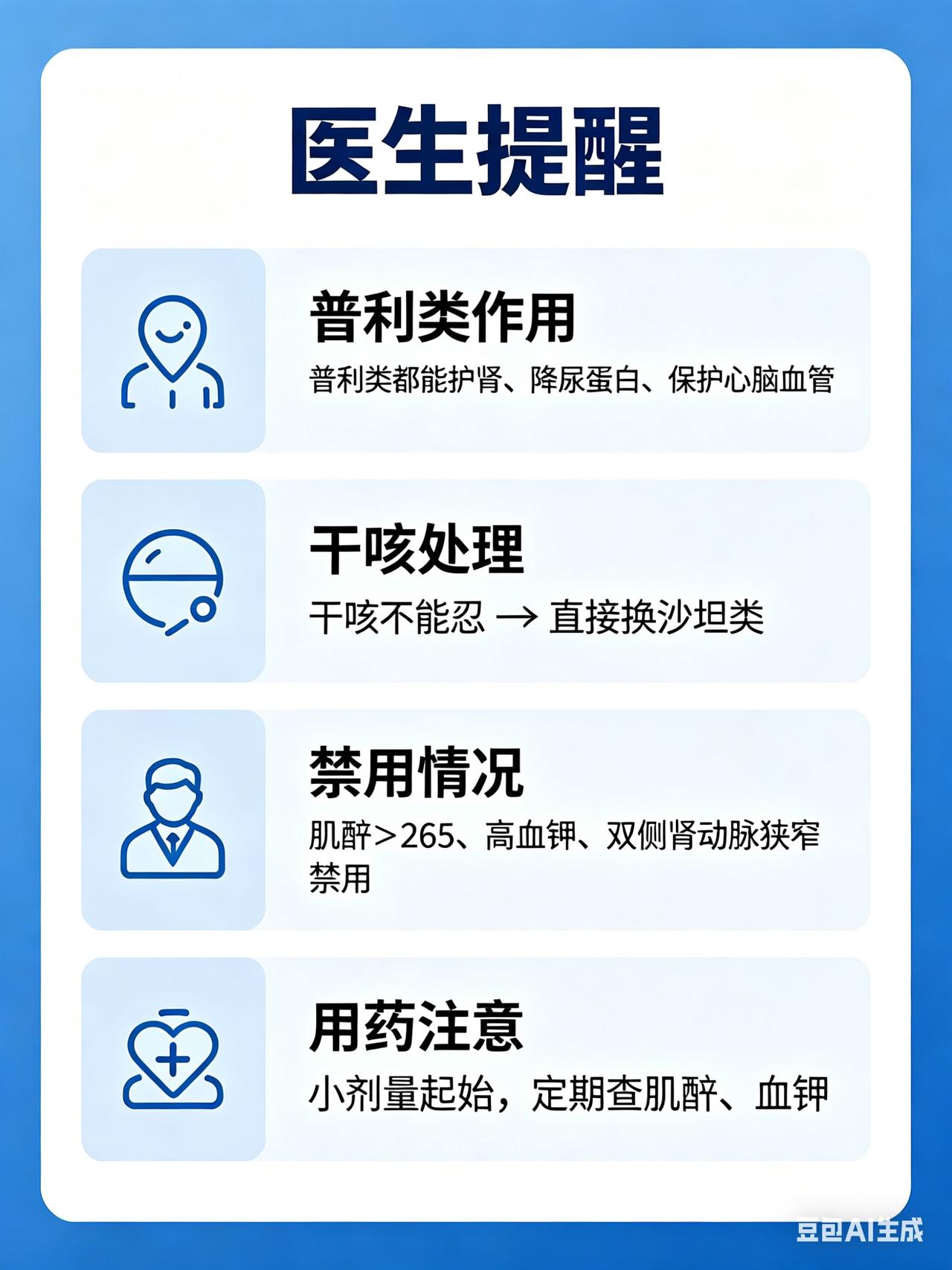 普利类(ACEI)降压药|效果排行 + 副作用最小排行(临床版) 一、降压强度排行(从强到弱) (适合血压偏高、需要强效降压的患者) 1️⃣ 贝那普利(洛汀新) ✅ 最强效、长效平稳、24小时控压 ✅ 护肾效果最好,糖尿病肾病首选 ✅ 适合合并冠心病、心衰、蛋白尿 2️⃣ 培哚普利(雅施达) ✅ 强效、平稳、心血管保护强 ✅ 适合老年高血压、冠心病、脑梗后 3️⃣ 雷米普利(瑞泰) ✅ 强效、半衰期长 ✅ 适合心衰、心梗后、高危人群 4️⃣ 依那普利(依苏) ✅ 中等偏强、便宜、临床最常用 ✅ 基层首选,性价比之王 5️⃣ 赖诺普利 ✅ 中等强度、不经肝脏代谢 ✅ 适合肝功能不好的患者 二、副作用最小排行(最安全、最不容易干咳) (适合怕咳嗽、体质敏感、老年人) 1️⃣ 贝那普利(洛汀新) ✅ 干咳发生率最低(约5%) ✅ 代谢温和、老人耐受最好 ✅ 护肾最强、副作用最少 → 综合之王 2️⃣ 赖诺普利 ✅ 干咳少、不经肝代谢 ✅ 肝肾不好都能用,安全性高 3️⃣ 培哚普利 ✅ 副作用温和,少见咳嗽 4️⃣ 依那普利 ✅ 便宜,但干咳率偏高(10–15%) 5️⃣ 卡托普利 ✅ 短效、降压快 ⚠️ 干咳率最高、副作用最多 → 不推荐长期用 三、一句话总结(可直接发微头条) 最强效:贝那普利>培哚普利>雷米普利 副作用最小、最安全:贝那普利>赖诺普利>培哚普利 综合最强、最护肾、最不容易咳:贝那普利(第一名) 四、医生提醒(必加) • 普利类都能护肾、降尿蛋白、保护心脑血管 • 干咳不能忍 → 直接换沙坦类 • 肌酐>265、高血钾、双侧肾动脉狭窄 禁用 • 小剂量起始,定期查肌酐、血钾 要不要我把这段内容直接改成微头条爆款文案(标题+正文+话题),你复制就能发?