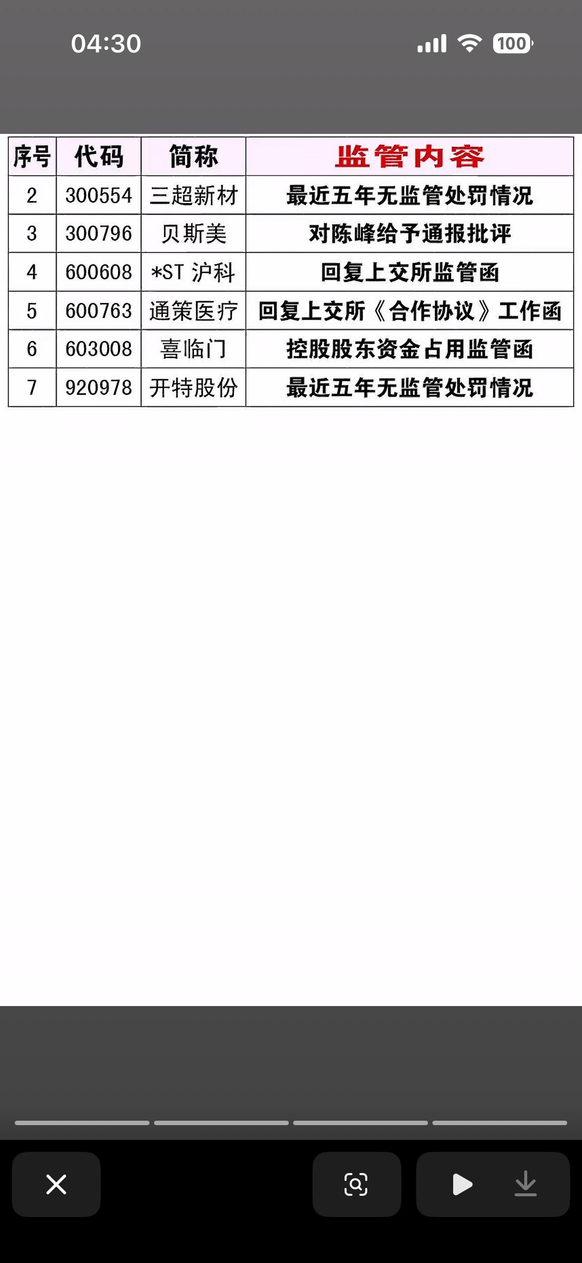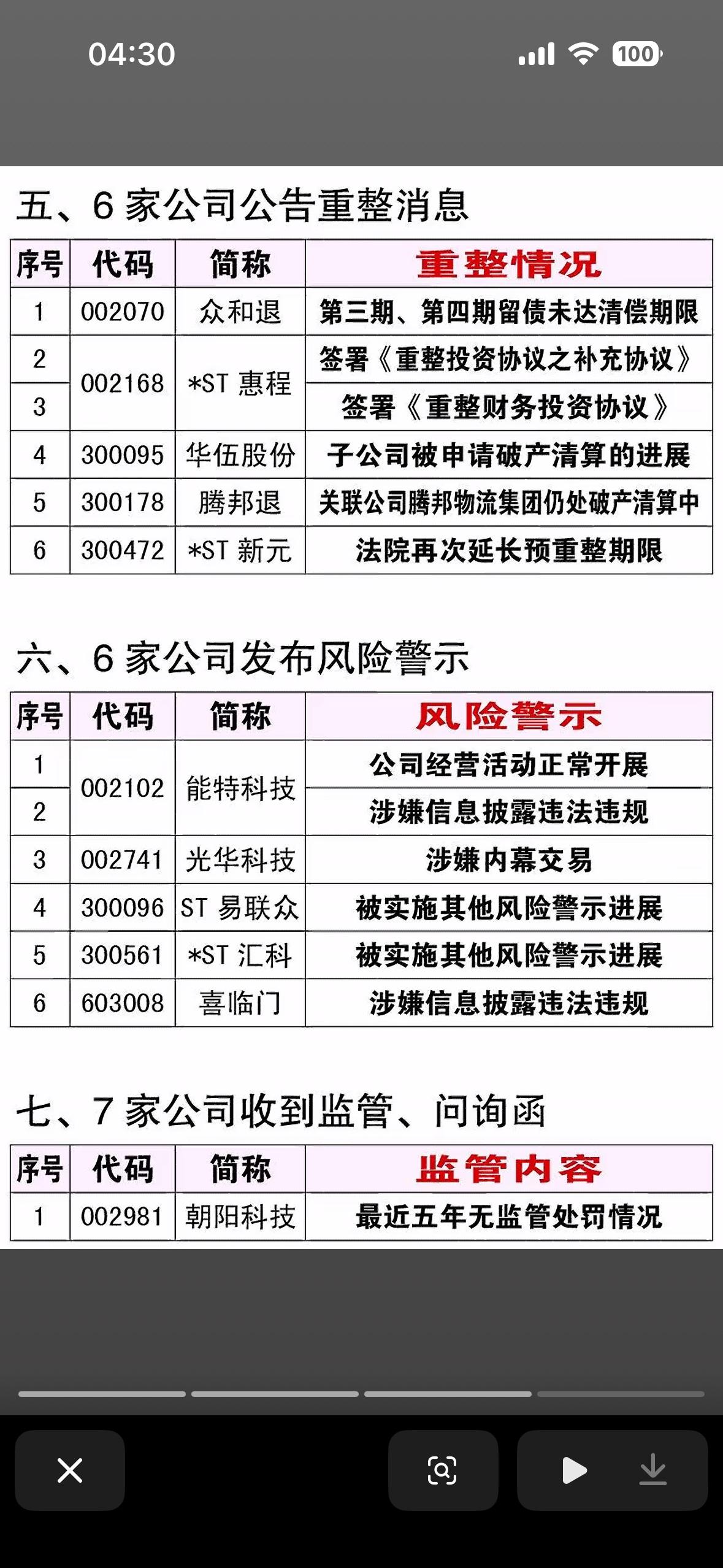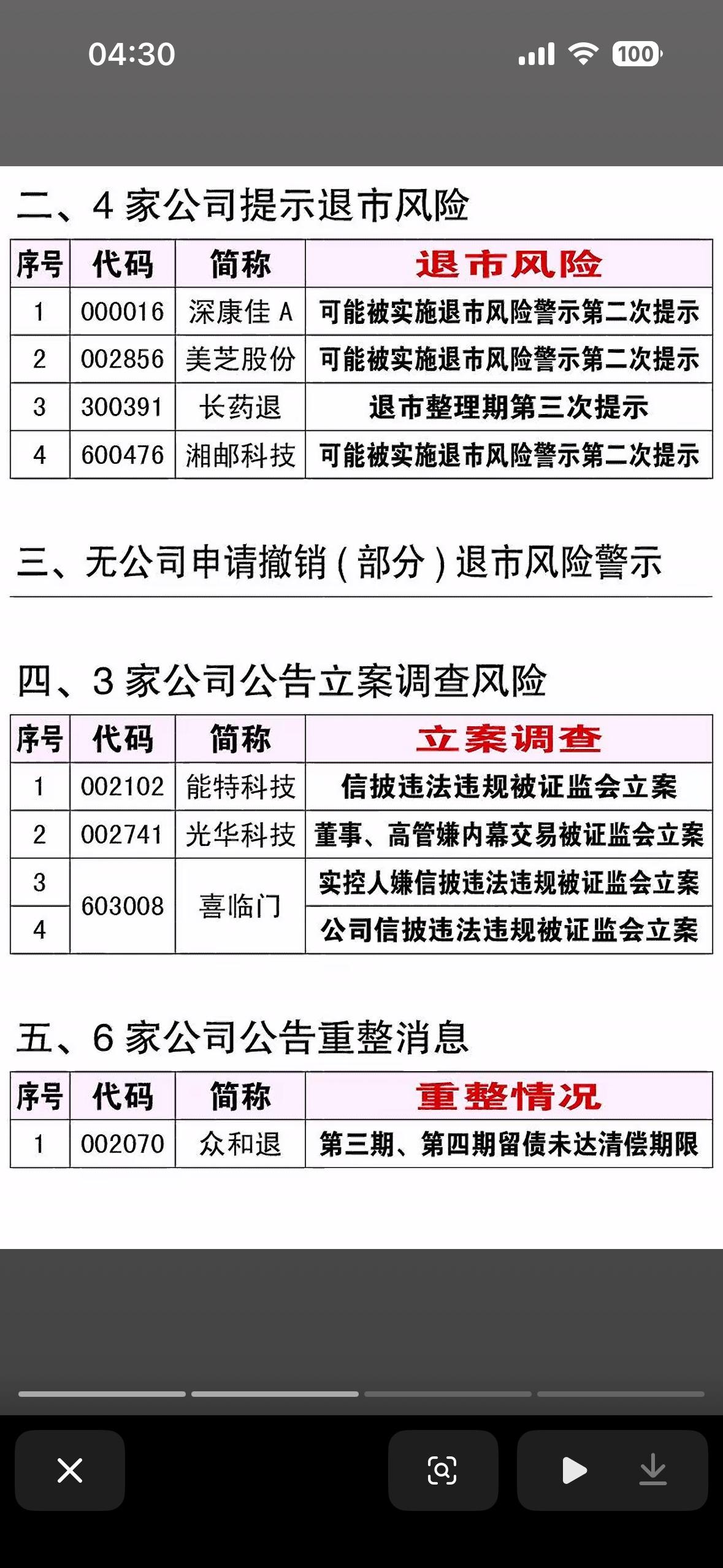 4月2日退市、立案、重整、风险提示 股市有风险,投资需谨慎!2026年4月2日早间数据显示,多家上市公司面临退市、立案调查、重整及监管问询等多重风险。 其中,能特科技(002102)、光华科技(002741)、喜临门(603008)等3家公司因信息披露违法违规、内幕交易等问题被证监会立案调查;ST万方(000638)、ST兰黄(000929)等8家公司提示终止上市风险,涉及市值、股价等多重因素;深康佳A(000016)、美芝股份(002856)等4家公司提示退市风险;众和退(002070)、*ST惠程(002168)等6家公司公告重整进展;此外,朝阳科技(002981)、三超新材(300554)等7家公司收到监管问询函。 投资者需密切关注相关公司公告,理性决策,规避潜在风险。市场波动加剧,谨慎操作为上策!
