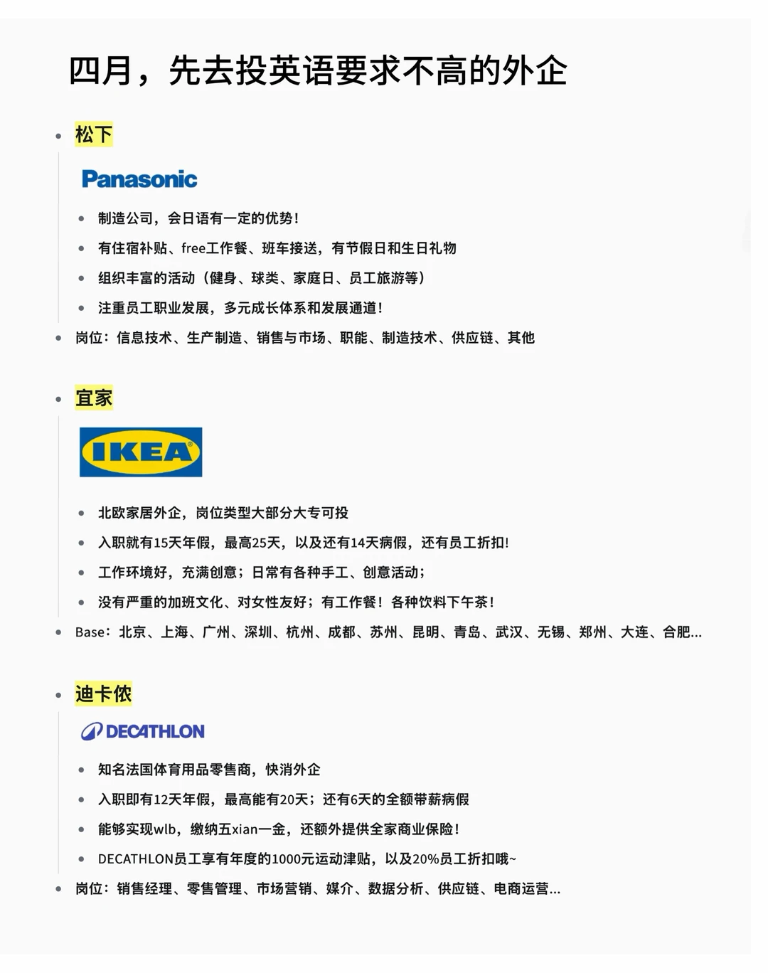 很多人一听到外企就先把自己劝退: 英语不够好、不敢开口、不敢投 · 但现实是,现在有相当一部分外企岗位 对英语的要求早就没你想象中高了,真的值得去试试! · 为什么建议大家去试试英语要求不高的外企? ✔️岗位偏本地业务、支持或执行岗,日常工作以中文为主 ✔️假期丰富,年假基本上是12天起步 ✔️外企对女性友好,注重wlb,工作氛围轻松 · 坚持日更,帮大家在找工作路上顺利拿 offer!