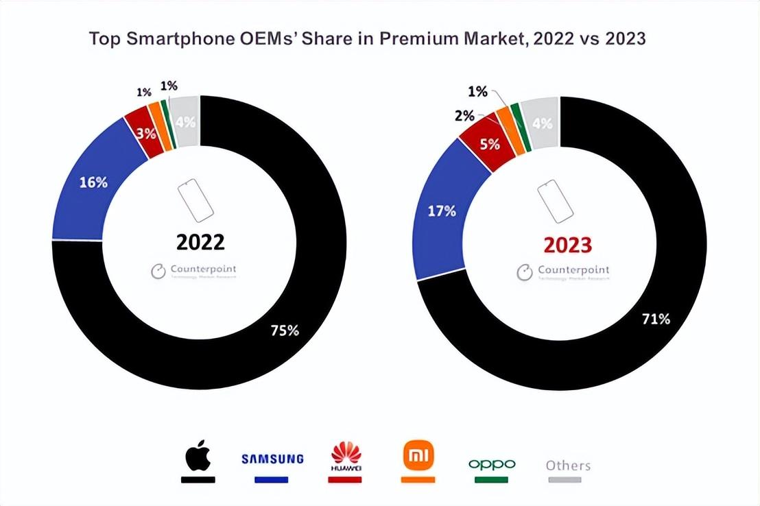 1. 全球市场份额提升:在2023年,华为在全球高端手机市场的份额从2022年的3%提升至5%,主要得益于Mate60系列的成功表现。