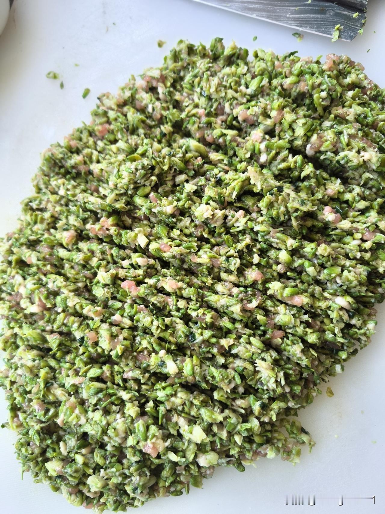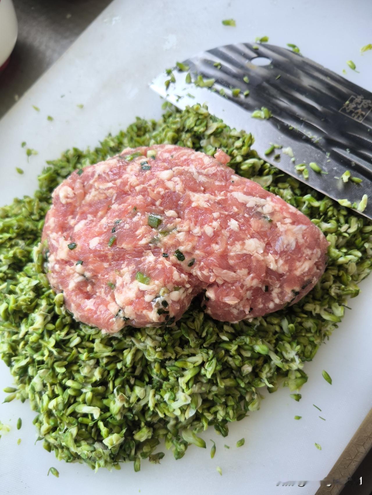 自己采摘或菜市场买的槐花要先去杂,用水浸泡后再在沸水里烫一下,凉后挤水,然后与肉一起剁成肉泥,放盐、胡椒粉、鸡精搅拌均匀即可包饺子了。