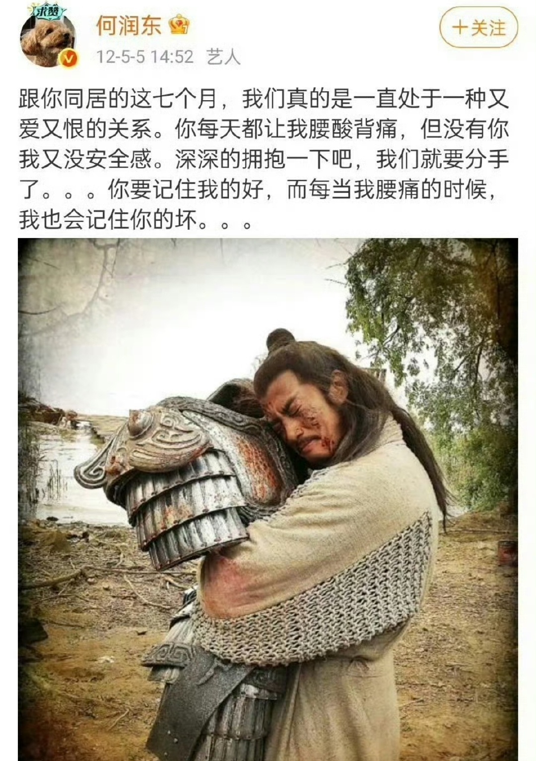 何润东你真的写文没轻没重。刚刷到这条的时候,我直接瞳孔地震,满脑子都是“哥你这是爆了什么惊天感情瓜?!”同居七个月、又爱又恨、每天腰酸背痛、没你就没安全感、要分手还记着你的好你的坏,这字字句句都往暧昧拉扯的路子上走,谁看了不脑补一出爱恨纠缠的大戏啊!结果手滑往下翻看到图片,我直接笑到打鸣!合着你深情款款告别的对象,是拍戏穿的一身盔甲啊?!合着腰酸背痛是天天穿重盔甲磨的,又爱又恨是拍戏离不了但穿起来又遭老罪了是吧?前半段氛围感直接拉满,我瓜都准备好吃了,结果就这?!何润东你真的太会吊人胃口了!
