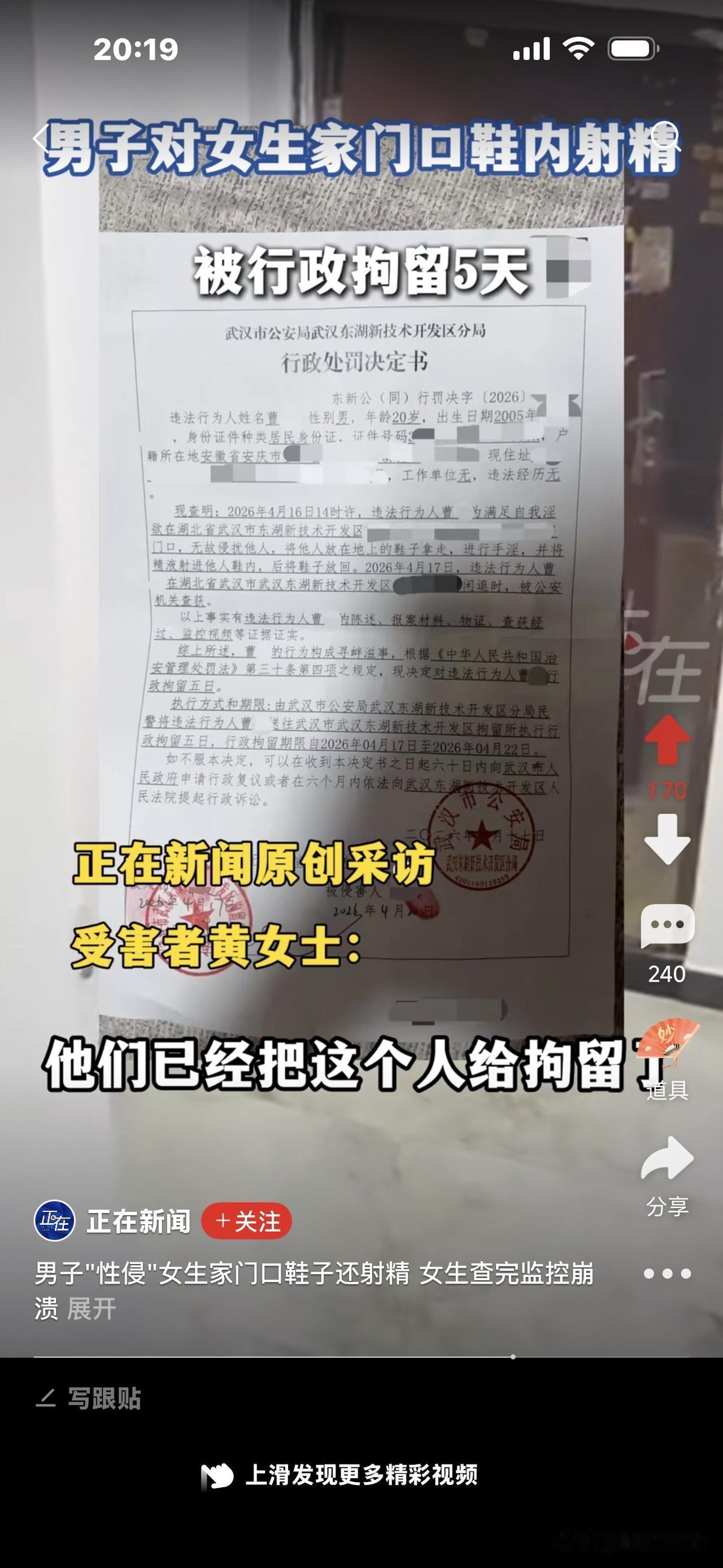拘留书上显示,男子姓曾,只有20岁,原籍是安徽安庆的,他把曾女士的鞋子拿起来,进行手x,对准喷射,然后又放回原地。