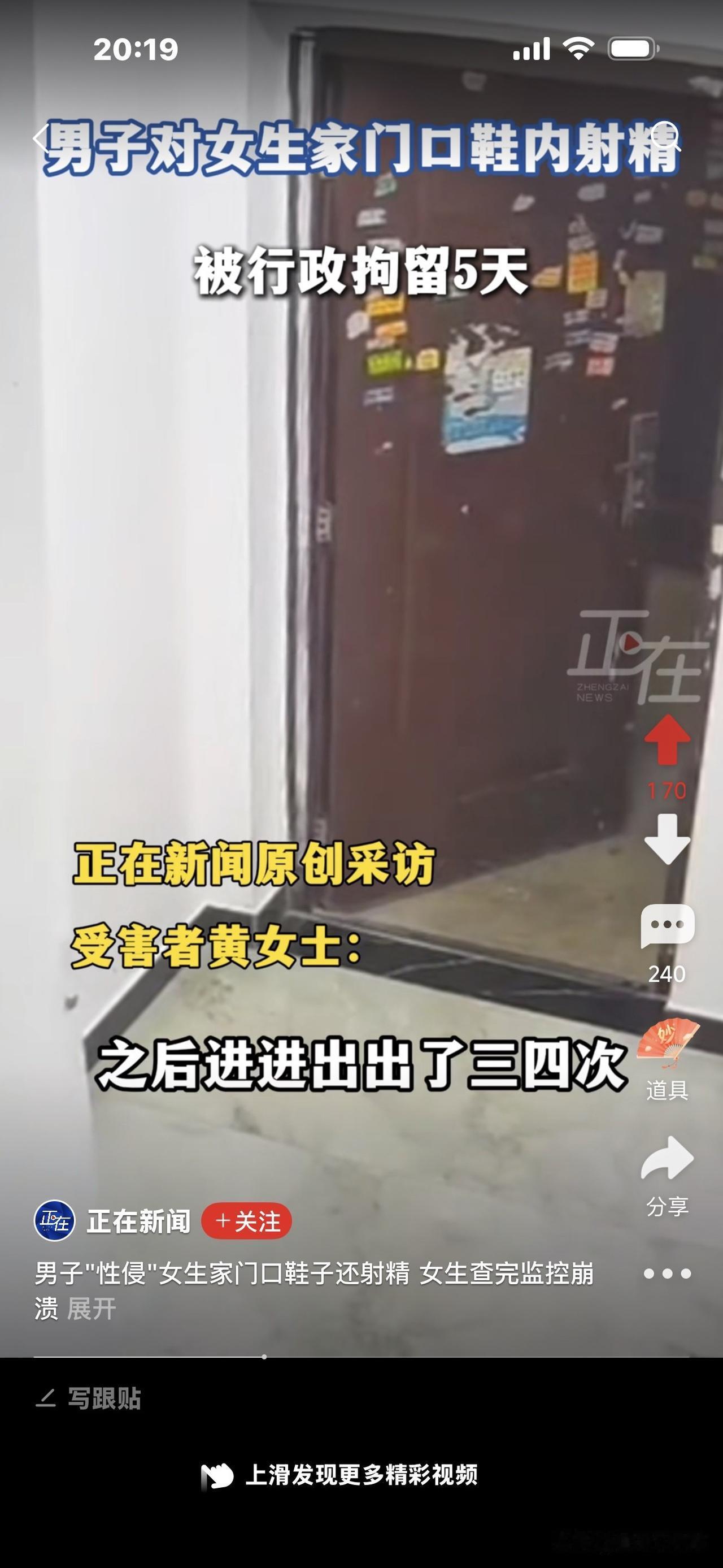 在监控视频里,黄女士看见了一个20岁左右的可疑男子,从大门口大摇大摆走进来,然后他反反复复进出门口3、4次,之后锁定了这名男子就是往她鞋里喷精的人。