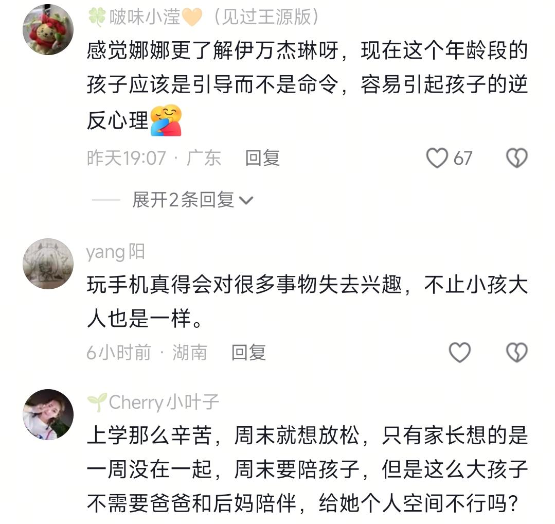 然后这事发酵之后,网友直接吵翻了。有人说孩子正处青春期,缺的是偏爱不是说教,胡扯什么不听话,说白了就是有了新的娃,大的就成多余的了?也有人说,或许是娜娜娘家事多,精力顾不上了,可能是吧,毕竟外人根本不知道家里的实情。之前听别人说,凡事都有来处和去处,你当初拼尽全力把孩子接回来,现在就该担起这份责任,不是吗?