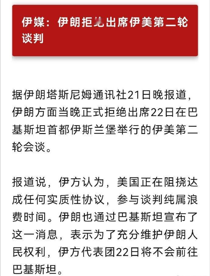 伊朗已明确表态拒绝参与第二轮谈判,直言与美国进行对话纯粹是浪费时间。