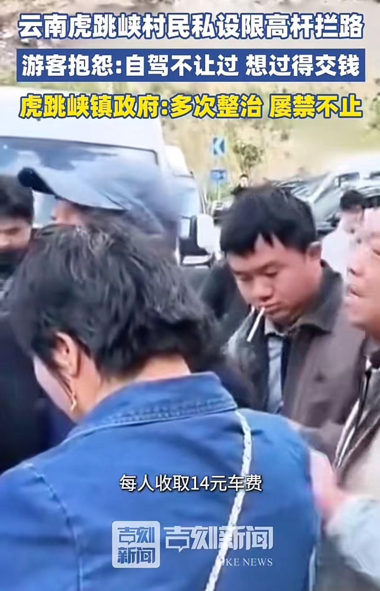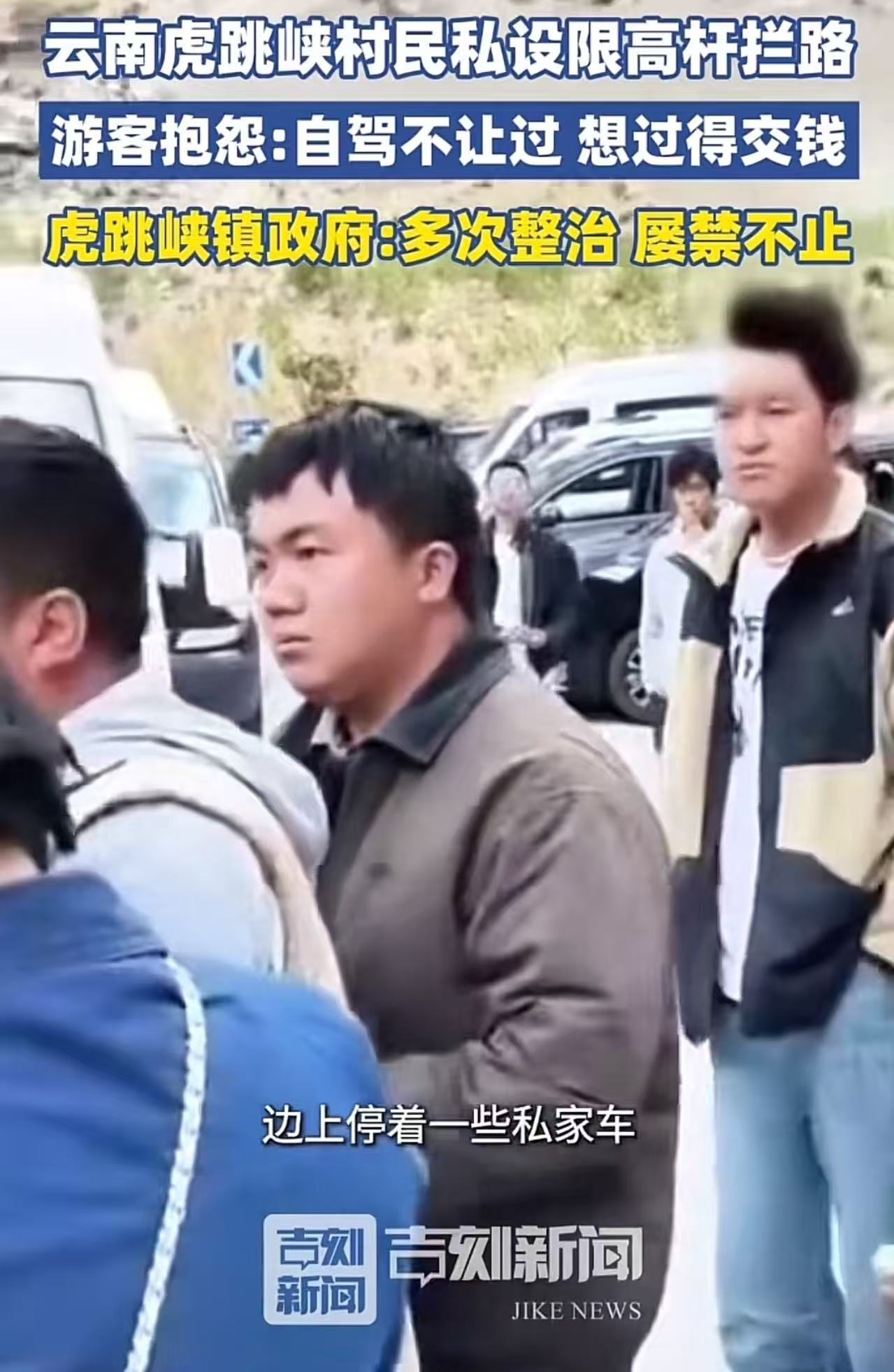 想钱想疯了!不少游客反映,虎跳峡村民私设限高杆拦路,想要通过就得交钱!游客抱怨:村民有什么权利设卡收钱?当地回应:多次整治,屡禁不止。网友:什么叫屡禁不止?刑事拘留,坐牢5年起,看谁敢!