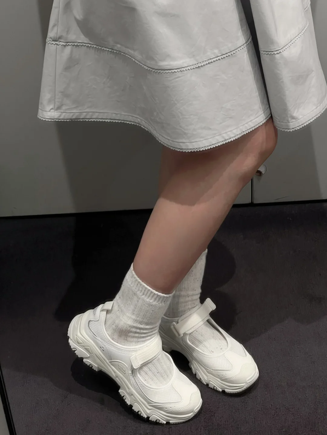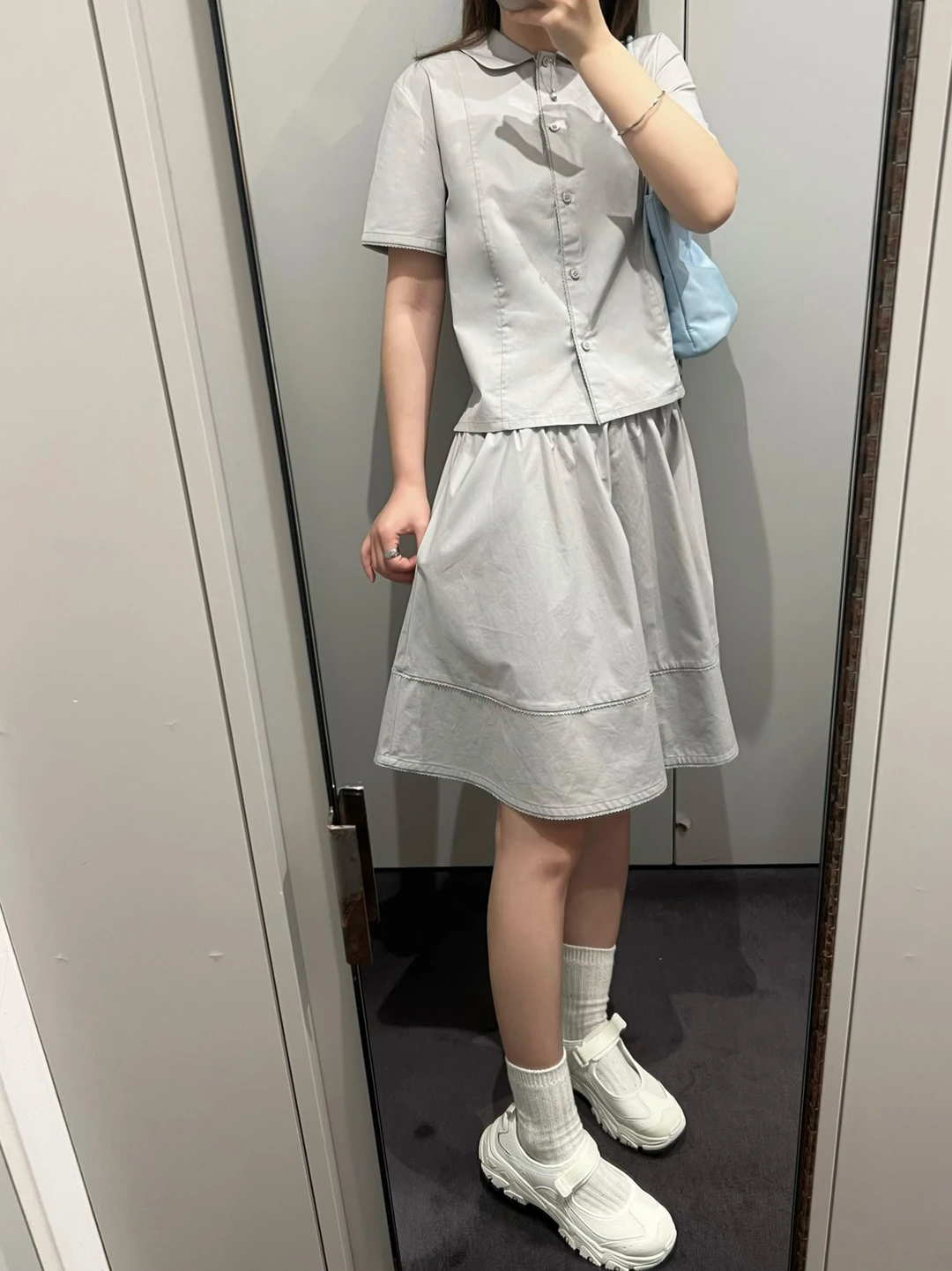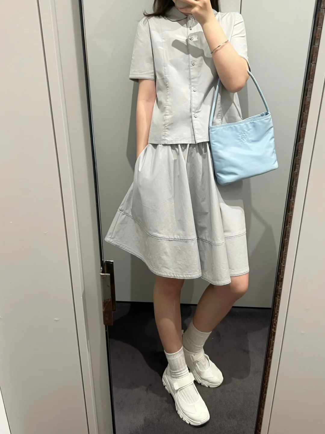 浅蓝色套装搭配上斯凯奇运动玛丽珍