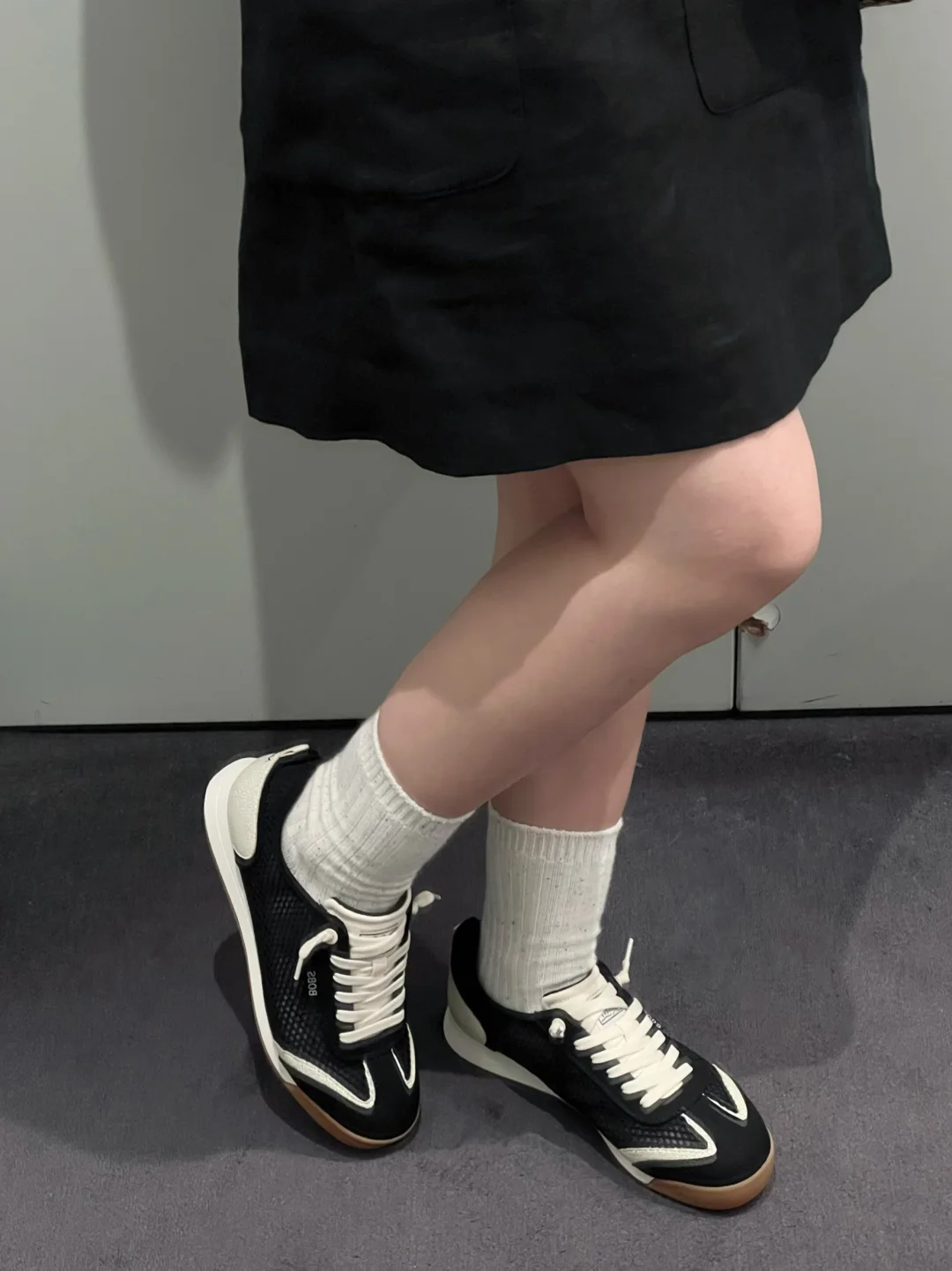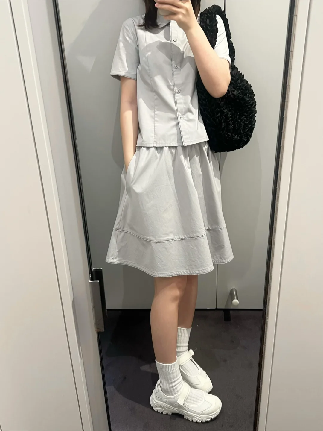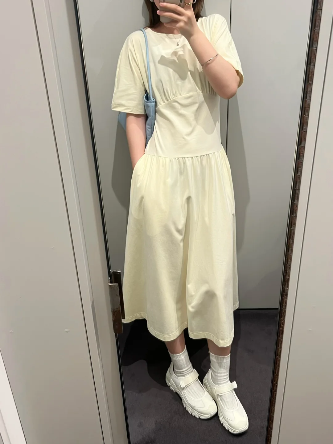 浅蓝色套装搭配上斯凯奇运动玛丽珍