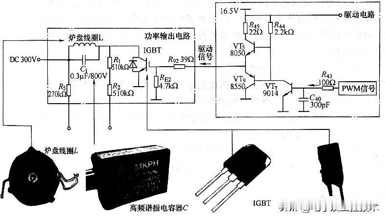 炉盘线圈的另一端与绝缘栅晶体管IGBT 的集电极相连,IGBT 高速交替地导通与截止,使炉盘线圈与高频电容的高频并联谐振路工作,于是线圈就会辐射出磁力线,这就是磁能。