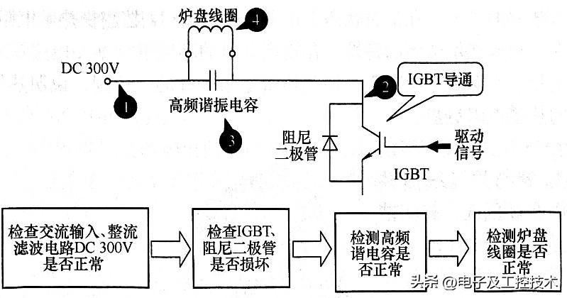 维修稍微复杂些的电路,熟悉它的工作过程是应该是药到病除的关键。比如这样一个电磁炉具体的率输出电路。如果出现无功率输出,我们就需要先分析一下它的工作过程。