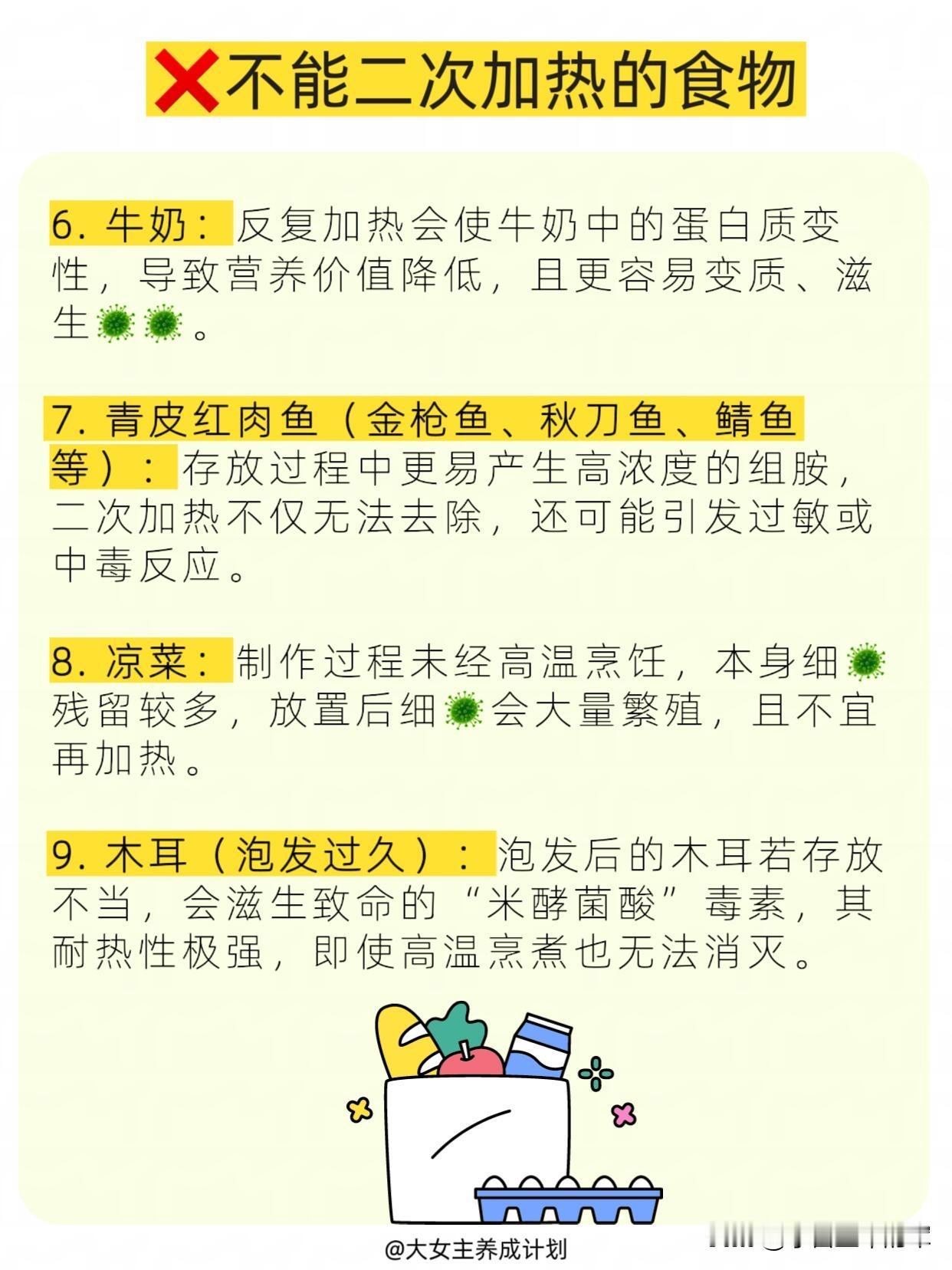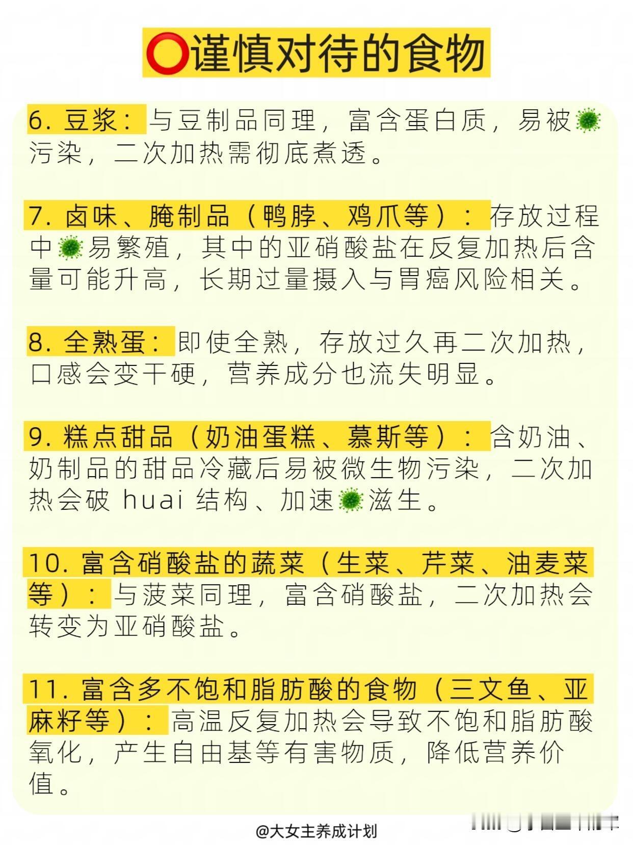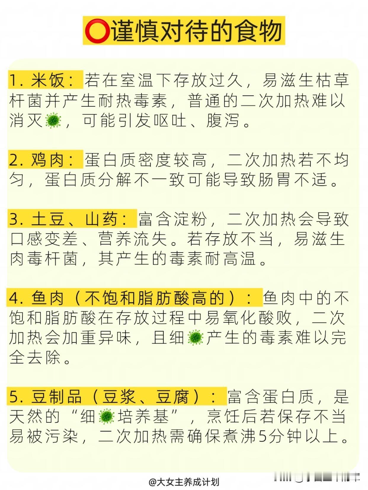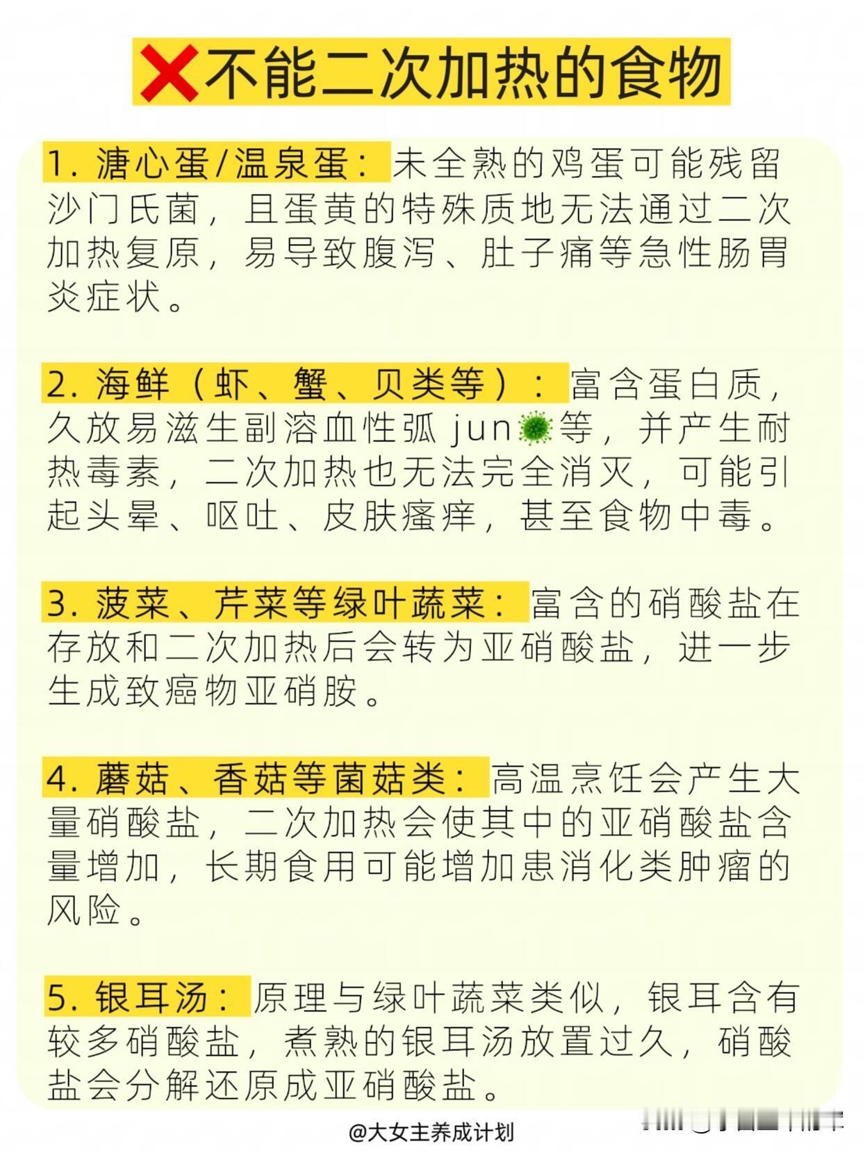 溏心蛋、海鲜、菠菜、蘑菇、银耳汤,这些我们常吃的食物,二次加热后要么容易滋生耐热毒素,要么会生成亚硝酸盐;牛奶、凉菜、泡发过久的木耳,更是热了也无法消除风险。就连米饭、鸡肉、土豆这些常见食材,存放不当再加热也可能引发肠胃不适。