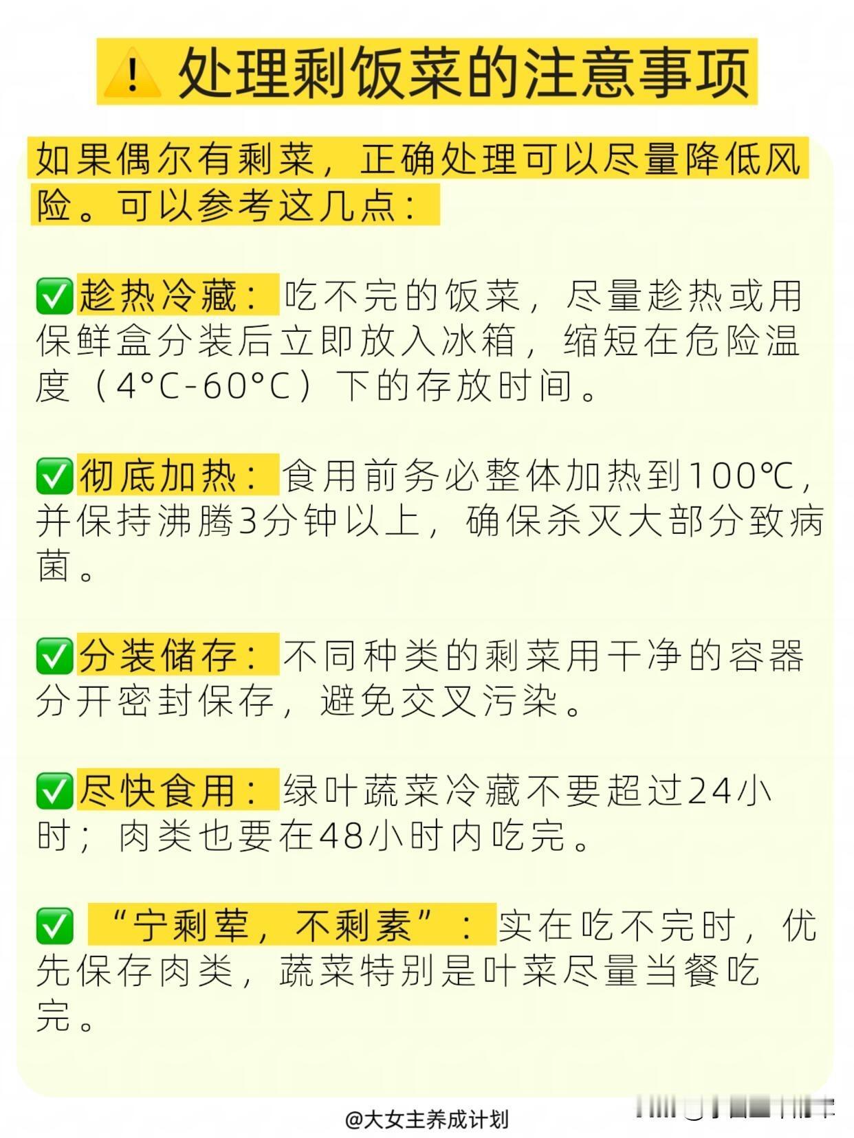 现在我家处理剩菜,都会尽量趁热冷藏、分装保存,吃前彻底加热到100℃,而且绿叶菜尽量当餐吃完,不再留到下一顿。原来“不浪费”也要讲方法,这些细节里藏着的,都是一家人的健康。