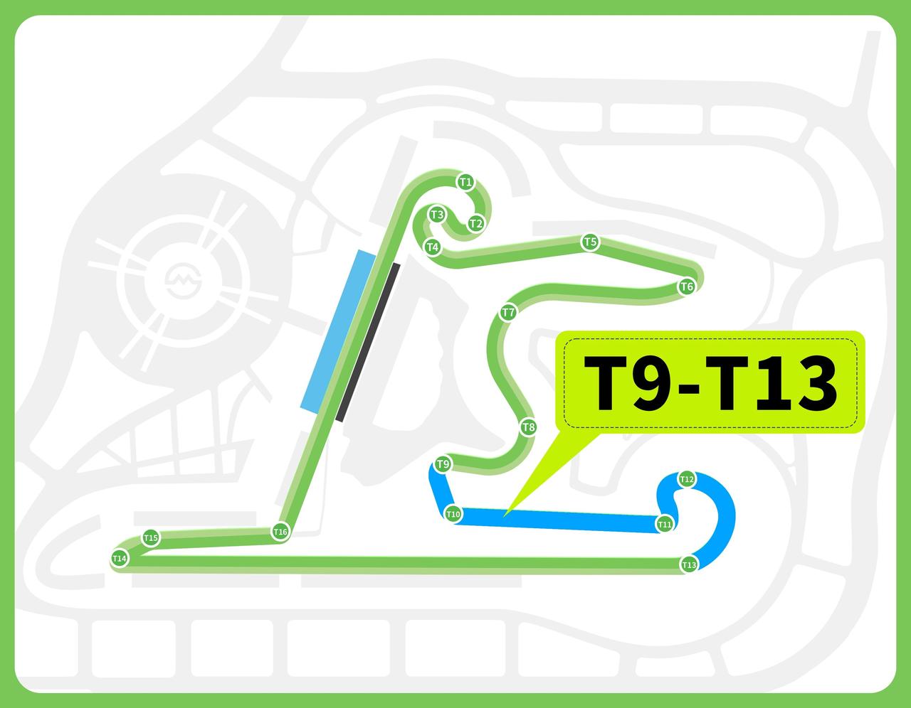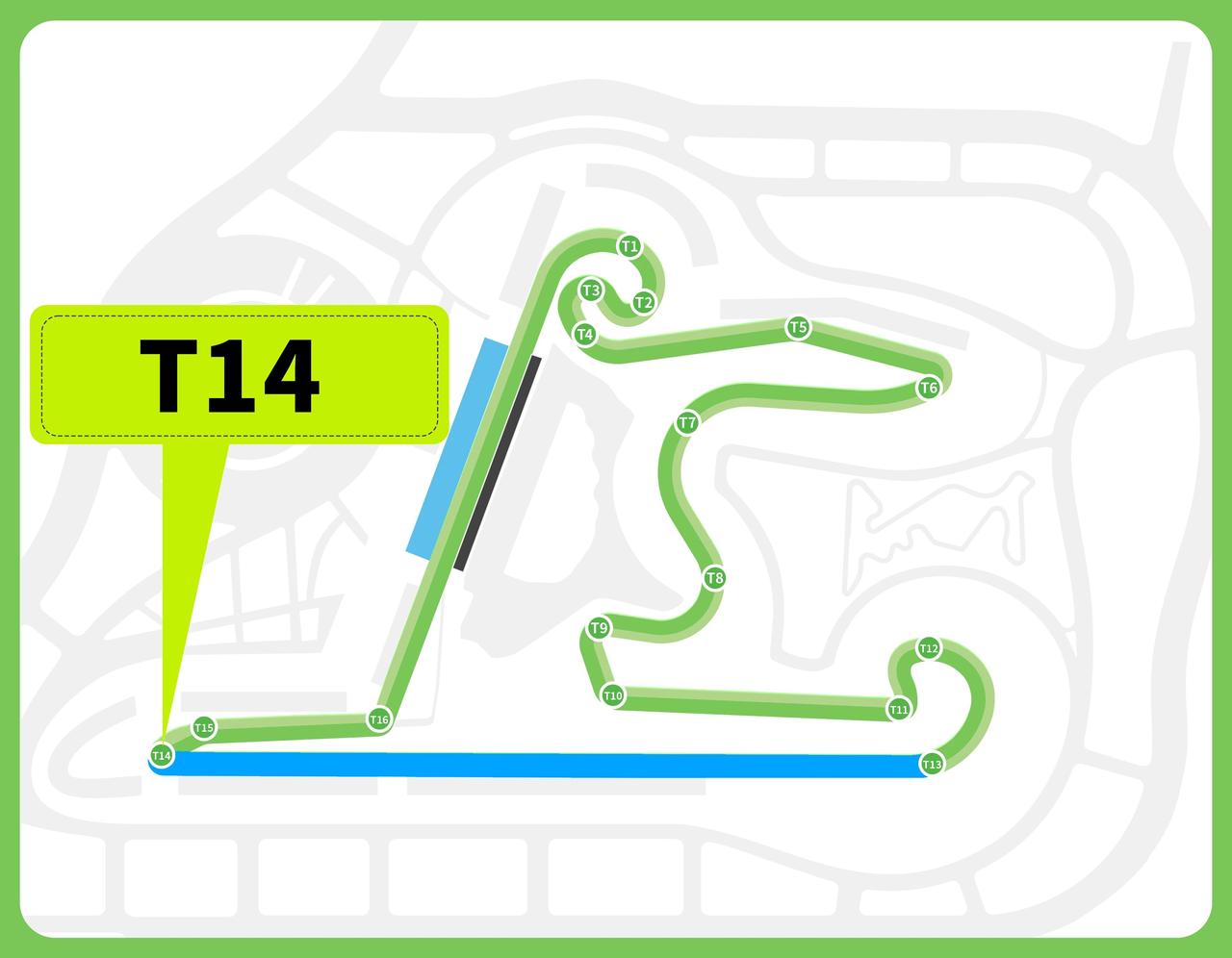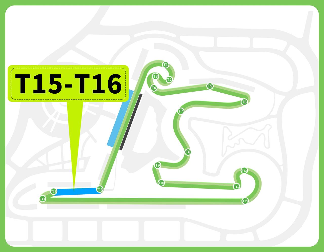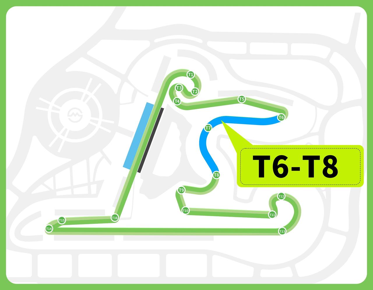 再说T11到T13,这是一组左-右-右的螺线型展宽弯,半径从8.8米一路扩到120.55米,还带巨大内倾角。听着复杂?说白了就是:车手可以用更快的速度过弯,但代价是轮胎磨损极快。谁能在这里把轮胎伺候好、保持长距离节奏,谁到后半程就有优势。这不是拼单圈速度,是拼整场比赛的“持久战”能力。
