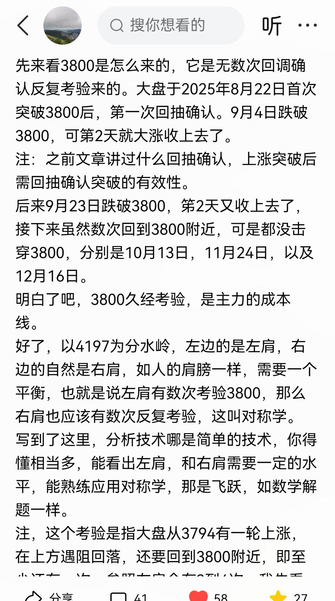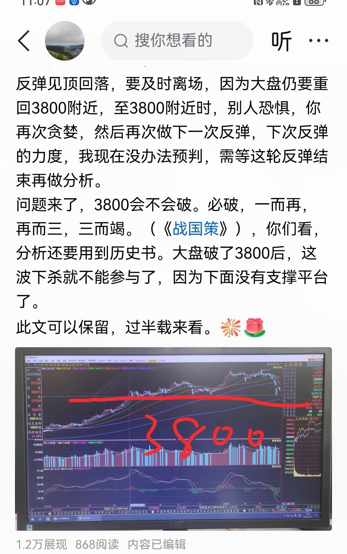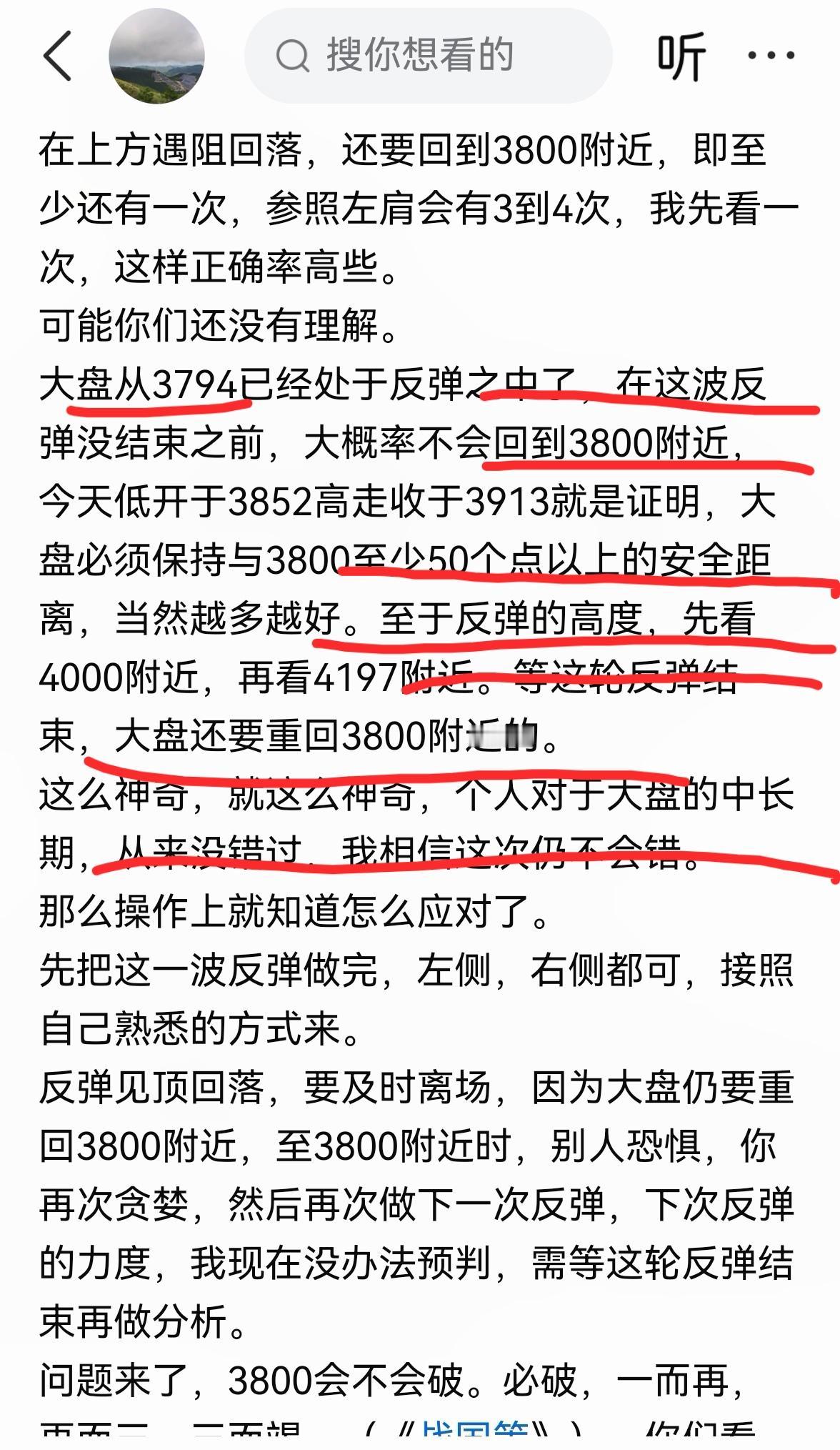 注意文章提示,反弹结束要2次回3800,估计大部分人不相信,就如大盘见3794时,文中讲会涨至4197附近,许多人不相信是一个道理,今天盘中最高4114,反弹有没有结束,我也不知道,不过,从操作的角度,不应该追高了。因为大盘随时会折返的,具体什么位置折返,天知道,我只能给个大致运动的轨迹,具体知道点数,那是神干的事。