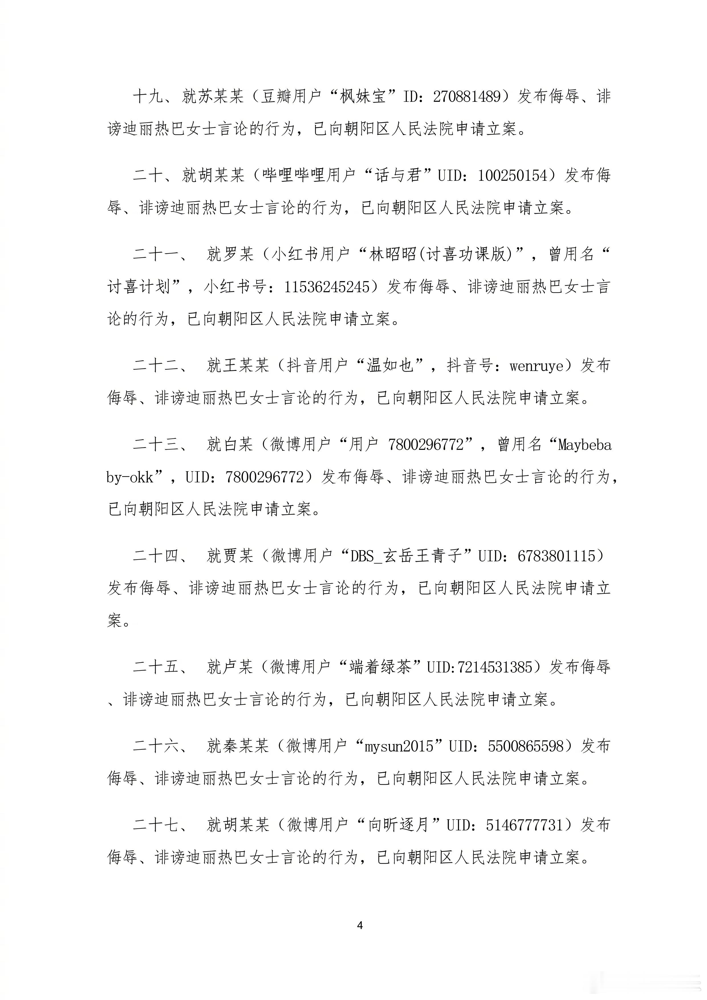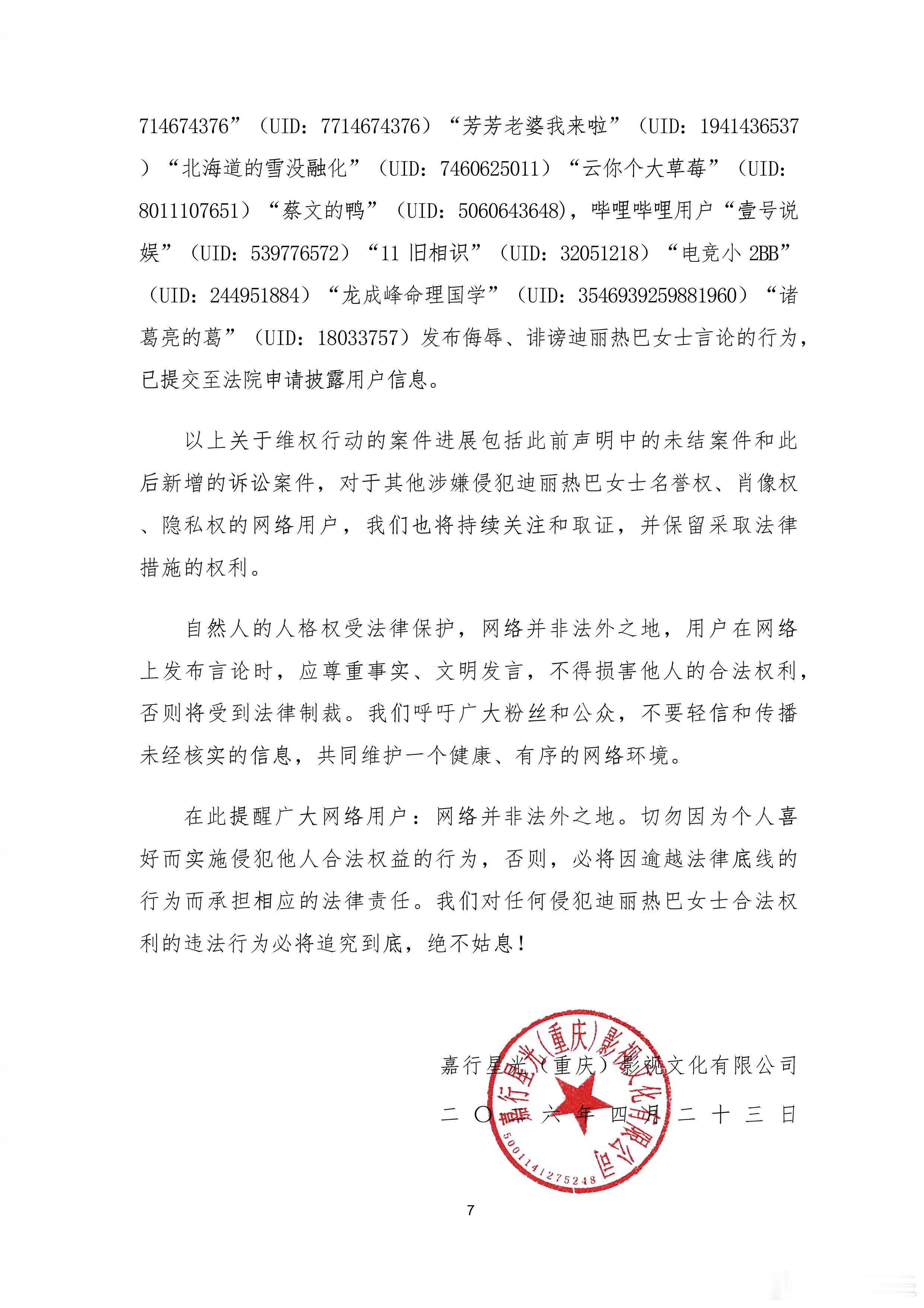迪丽热巴方公布告黑维权进展今日,迪丽热巴工作室更新维权进展,针对近期网络用户发布和传播对迪丽热巴女士的侮辱、诽谤言论,以及利用AI换脸技术侵犯其肖像权等行为,发布超长通告进行一并说明。 曝迪丽热巴和嘉行签了一年短约