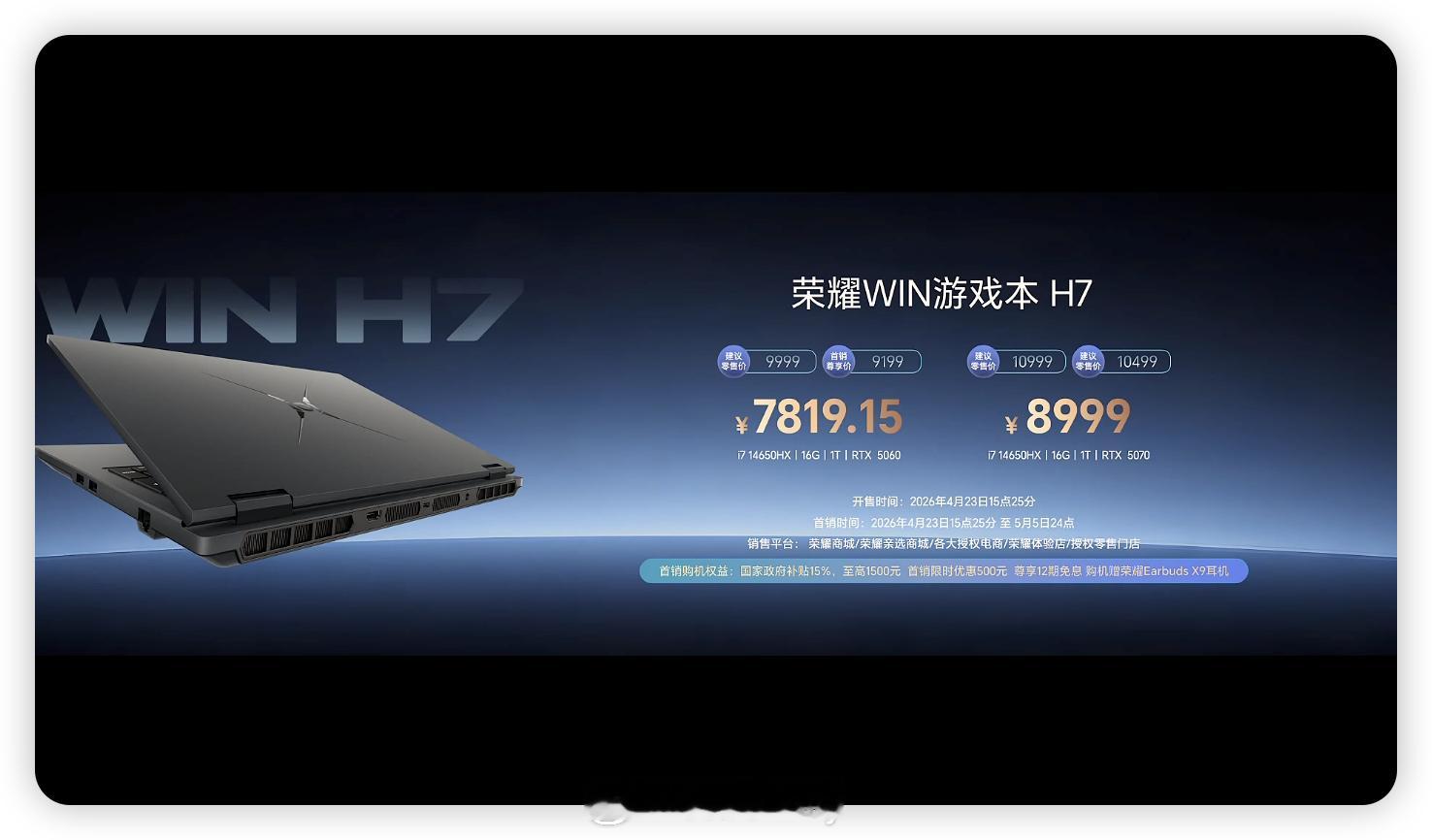 最强打洲本荣耀WIN游戏本 H9国补到手价9999元起,5月6日开启全渠道首销。荣耀WIN游戏本 H7国补到手价7819.15元起,现已全渠道开售。