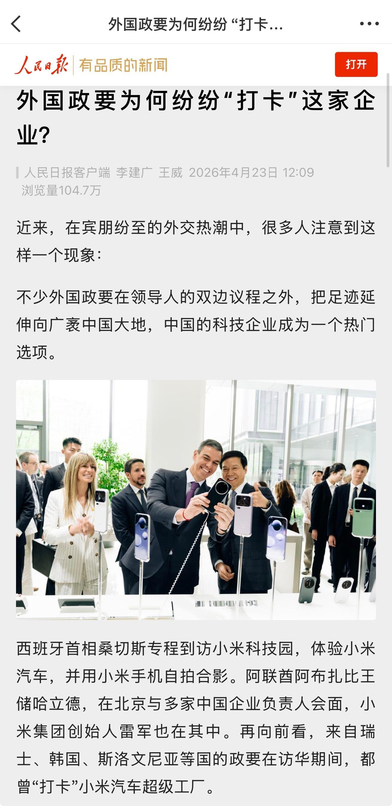 今天,人民日报新媒体推出深度报道「外国政要为何纷纷“打卡”这家企业?」,从西班牙首相访问小米科技园入手,认为「小米已经成为外国政要纷纷探访的“新地标”」,反映出中国企业在新一轮科技革命和产业变革大潮中的领先姿态和开放态度。