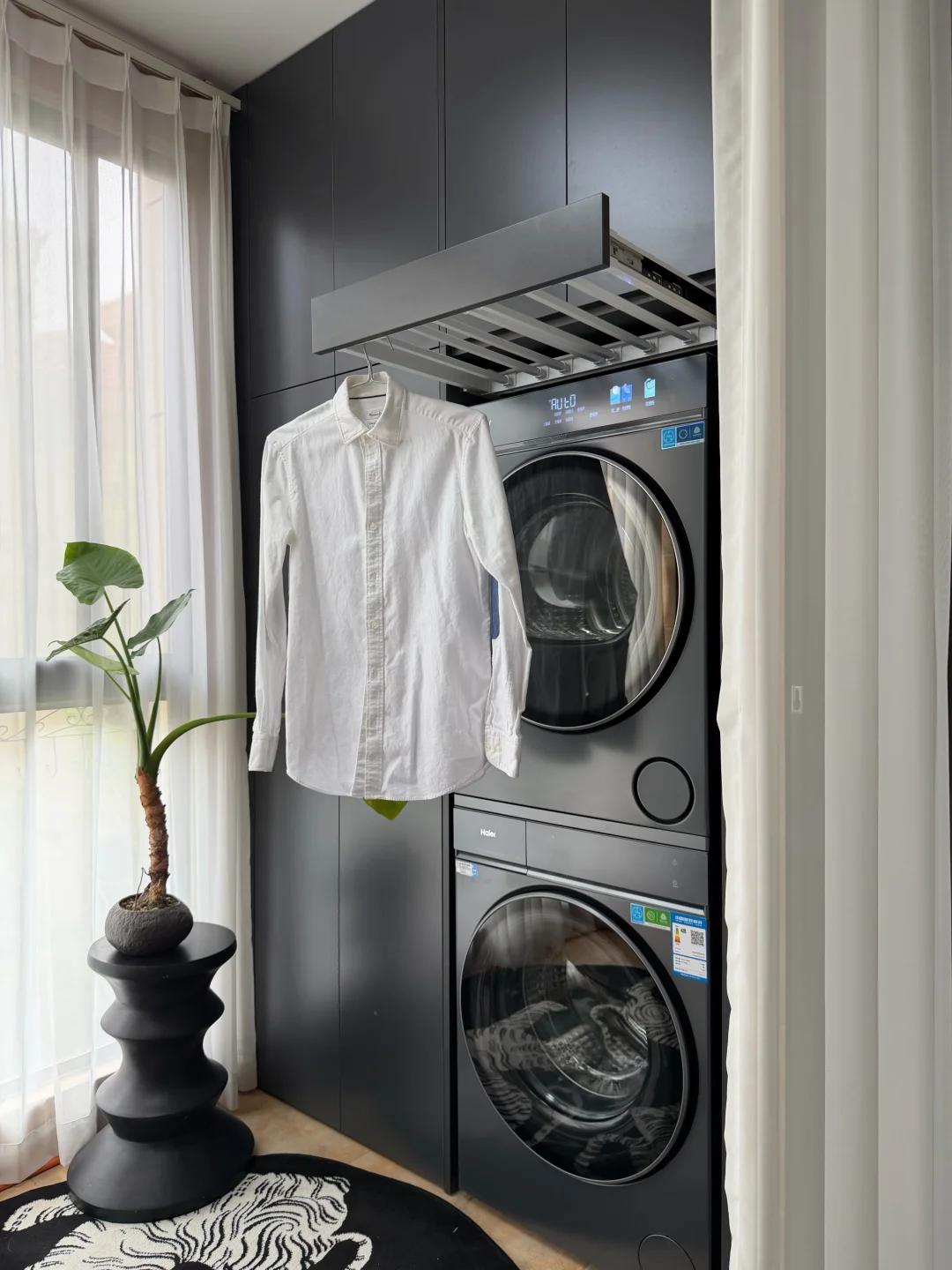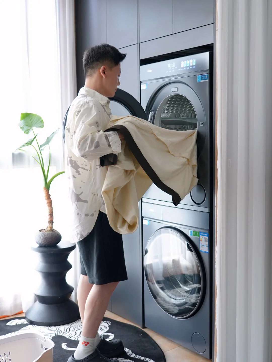 洗床单四件套之类的大件一次全部搞定就很省心, 590mm的超薄机身全嵌入阳台高柜,让整个阳台都更简约高级