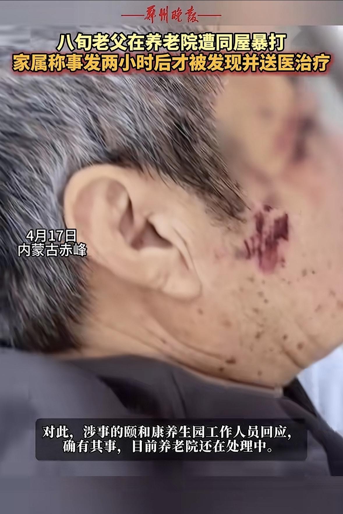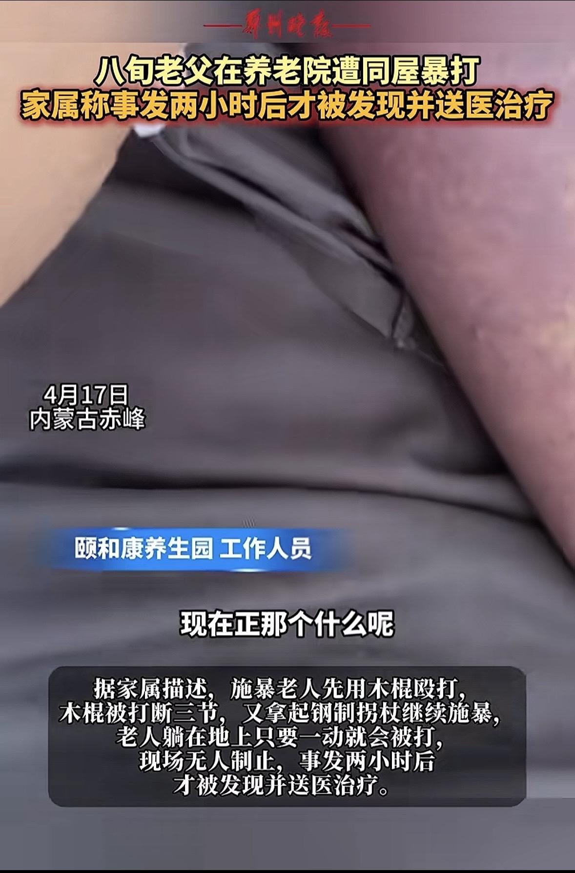 内蒙古赤峰,男子接到消息,自己年过八旬的老父亲在养老院被同屋老人打了,对方拿着木棍打他爸,力道大到硬生生把木棍打成了三节,木棍打断后对方又换成钢制拐杖继续打,他父亲躺在地上不敢动,因为只要稍微一动就会被打,更让男子气愤的是,现场没有工作人员站出来阻止,直到事发2小时后,父亲才被送医治疗。看着父亲被打到头皮都缝了针,男子心碎了。
