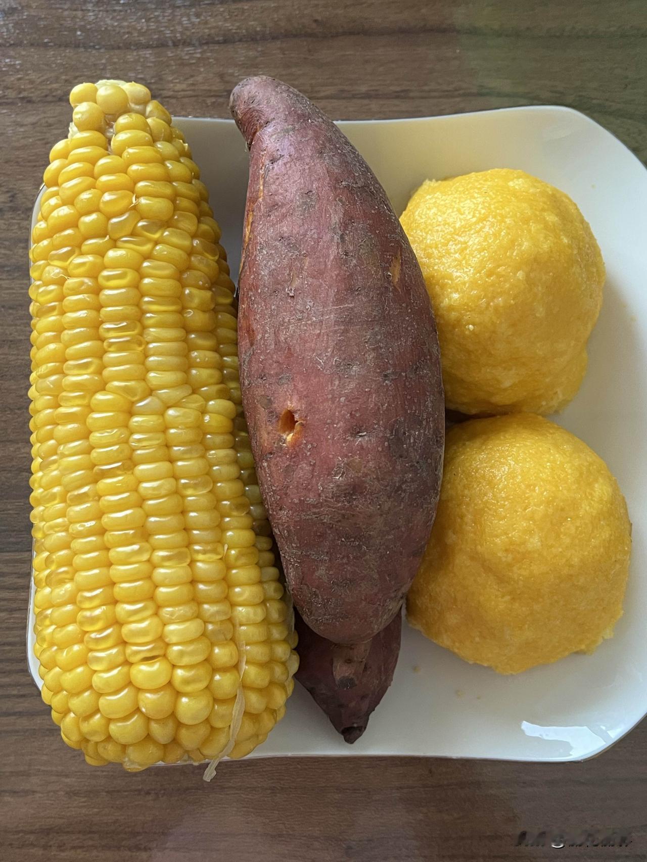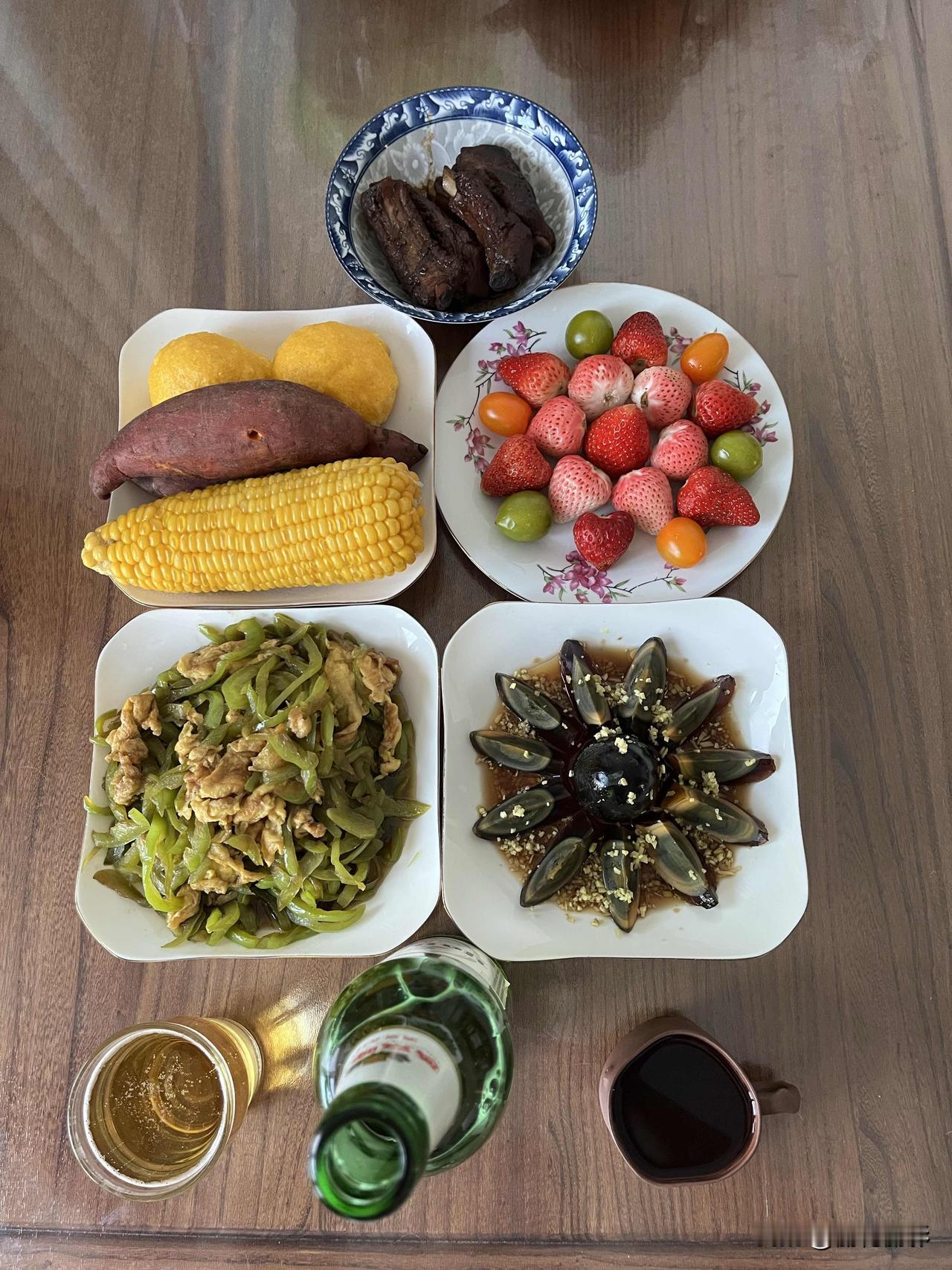 今儿一早出去玩了,晚上做点儿简单的,就炒了一个鸡蛋辣椒,弄一个松花蛋和果盘,把红薯、窝头,玉米、排骨一起蒸了,一顿简单美味的晚餐就齐了。