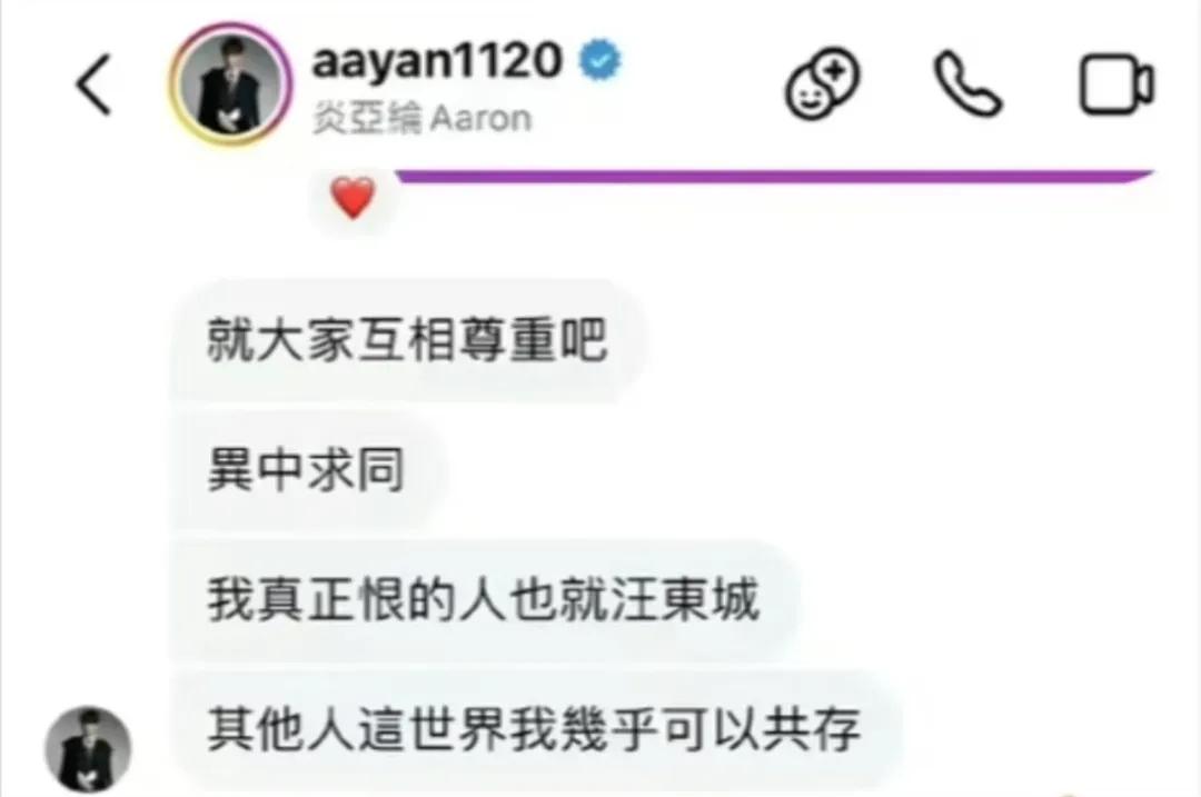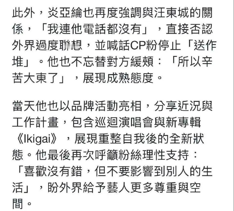 炎亚纶表示自己虽然“身经百战、耐受力比较高”,但汪东城长期下来已经忍受到一个极限,他呼吁粉丝要有边界感,不要干扰到别人的生活,还喊话汪东城辛苦了[允悲]