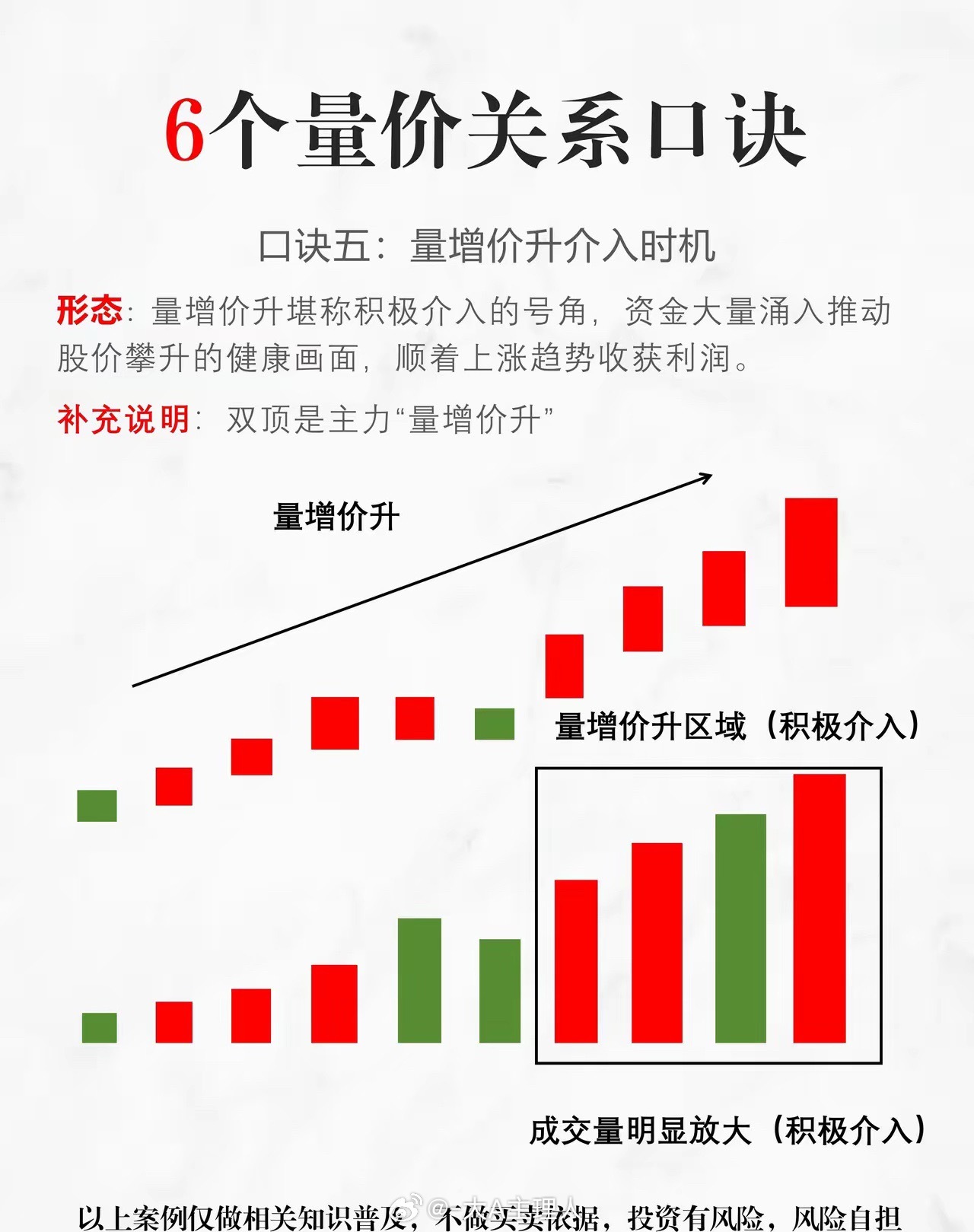 量价关系口诀,好记又实用: 1. 价涨量增,顺势而为2. 价涨量缩,上涨乏力3.