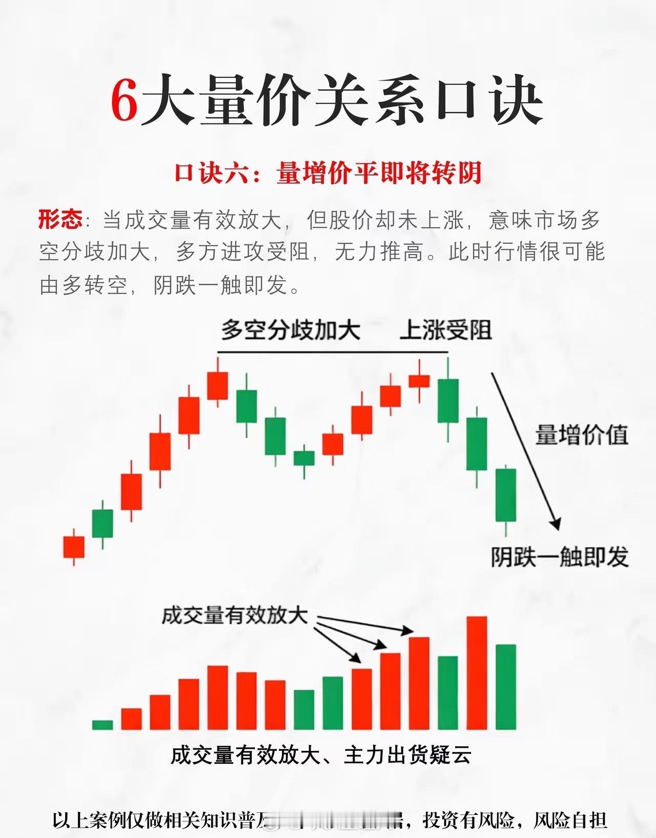 量价关系口诀,好记又实用: 1. 价涨量增,顺势而为2. 价涨量缩,上涨乏力3. 价跌量增,下跌加速4. 价跌量缩,跌势将止5. 价平量增,变盘在即6. 价平量缩,观望为宜