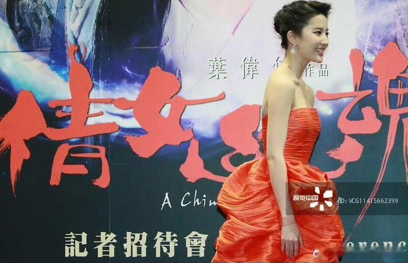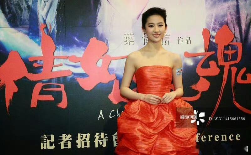 背景是电影《倩女幽魂》的记者招待会背景板,与红裙形成强烈色彩呼应,自带电影宣传活动的热闹与隆重。