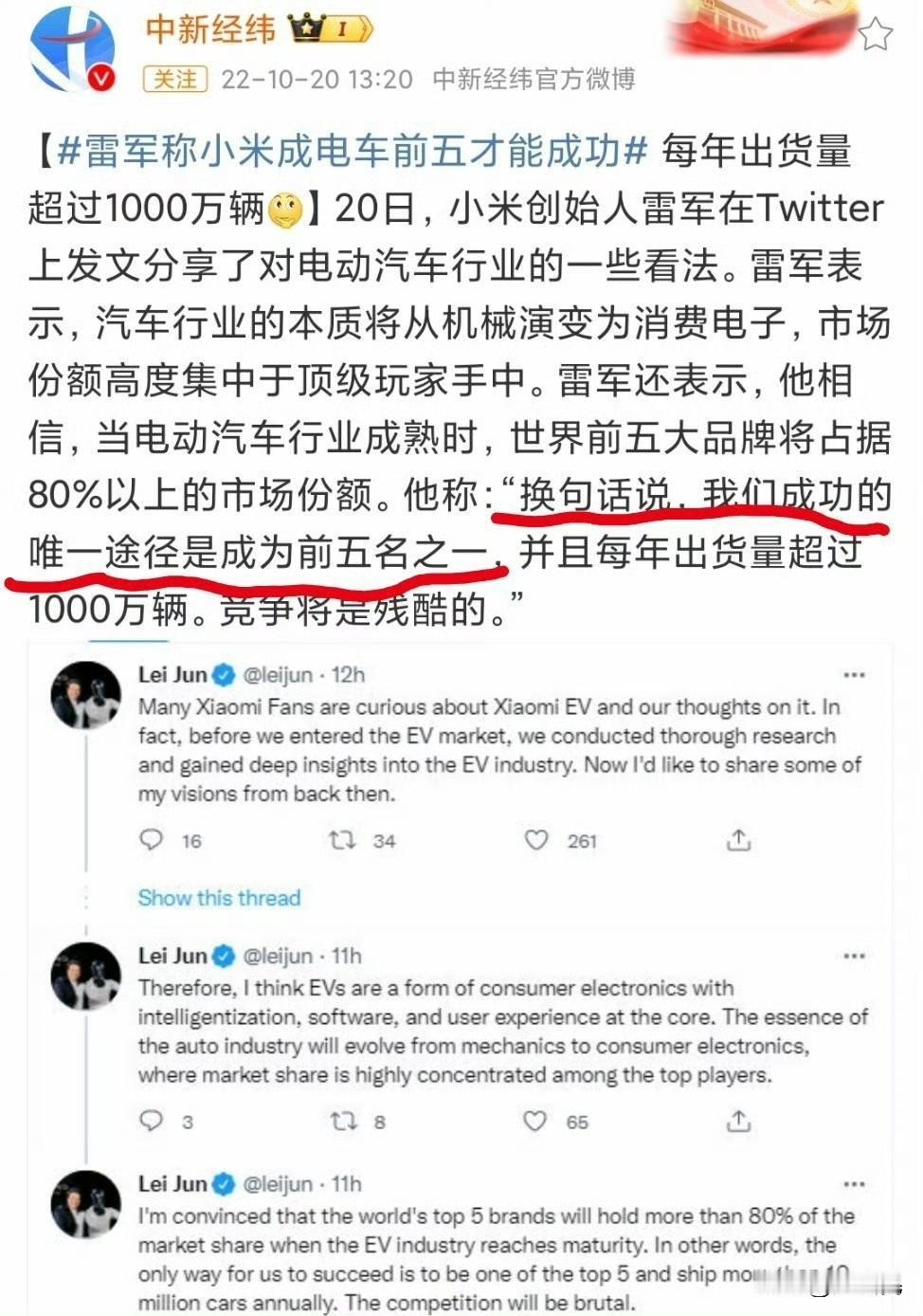 看得出来,雷军要让小米汽车成为世界前五名的决心一直没变。
