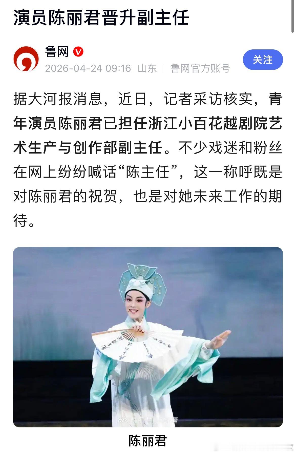 陈丽君晋升副主任陈丽君已担任浙江小百花越剧院艺术生产与创作部副主任。公开资料显示