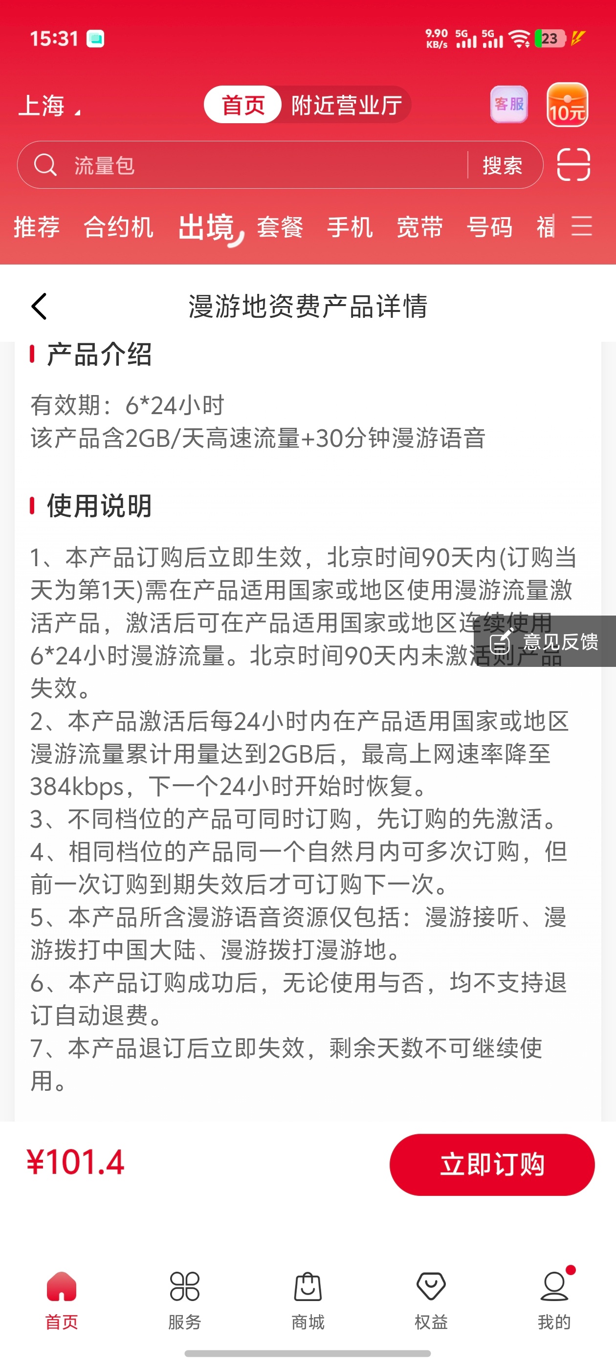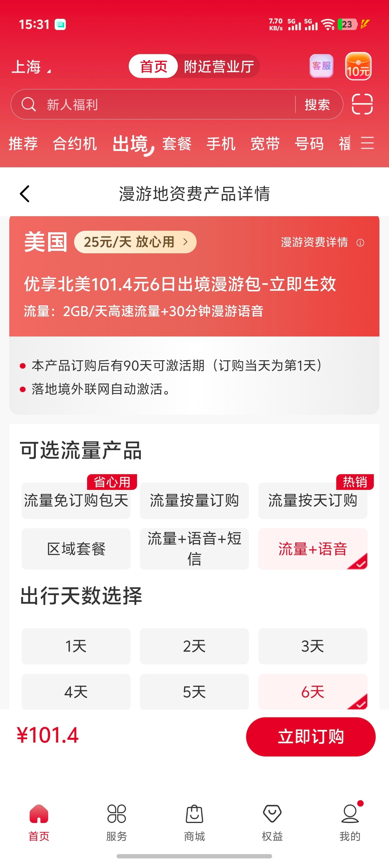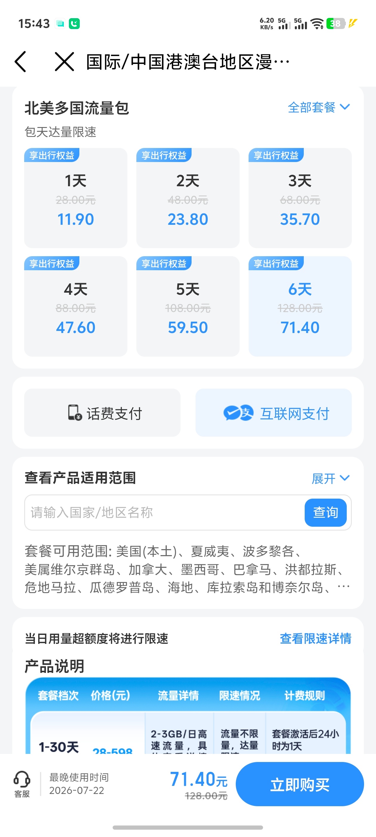 中国移动的套餐价格是6天,每天2G高速流量,用完限速好像一样,送20分钟语音漫游,价格是71.4元。#中国移动##中国联通#