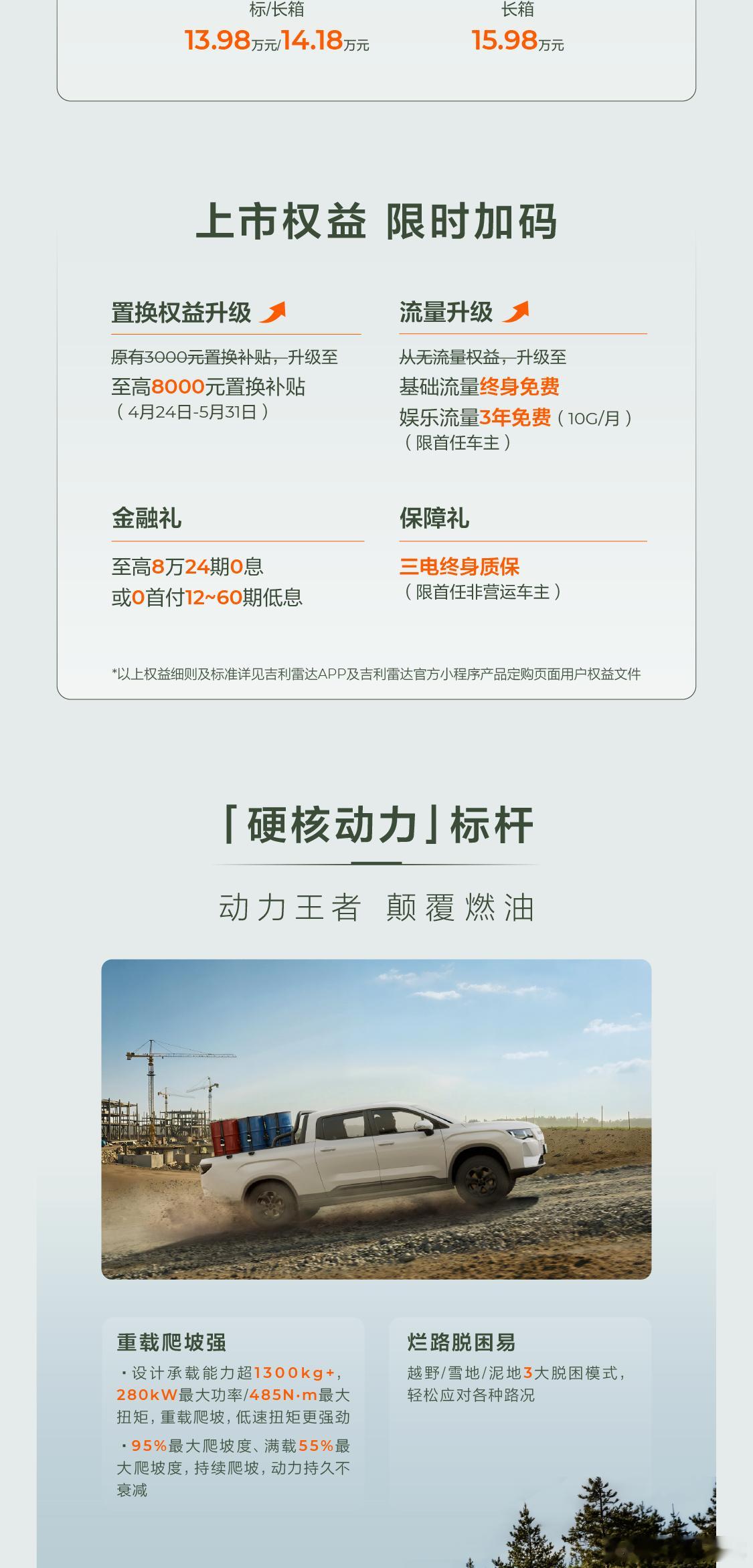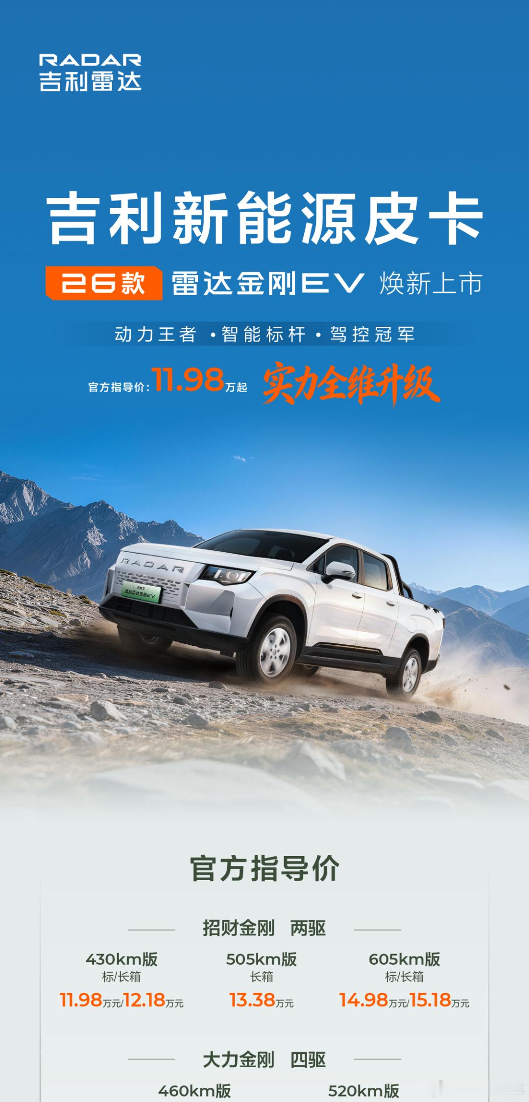 11.98万元起!2026款吉利雷达金刚EV焕新上市动力王者智能标杆 实力全维升级硬核动力,重载爬坡强,烂路脱困易皮卡首发Flyme Auto智能座舱系统上市权益限时加码,焕新就现在!吉利新能源皮卡
