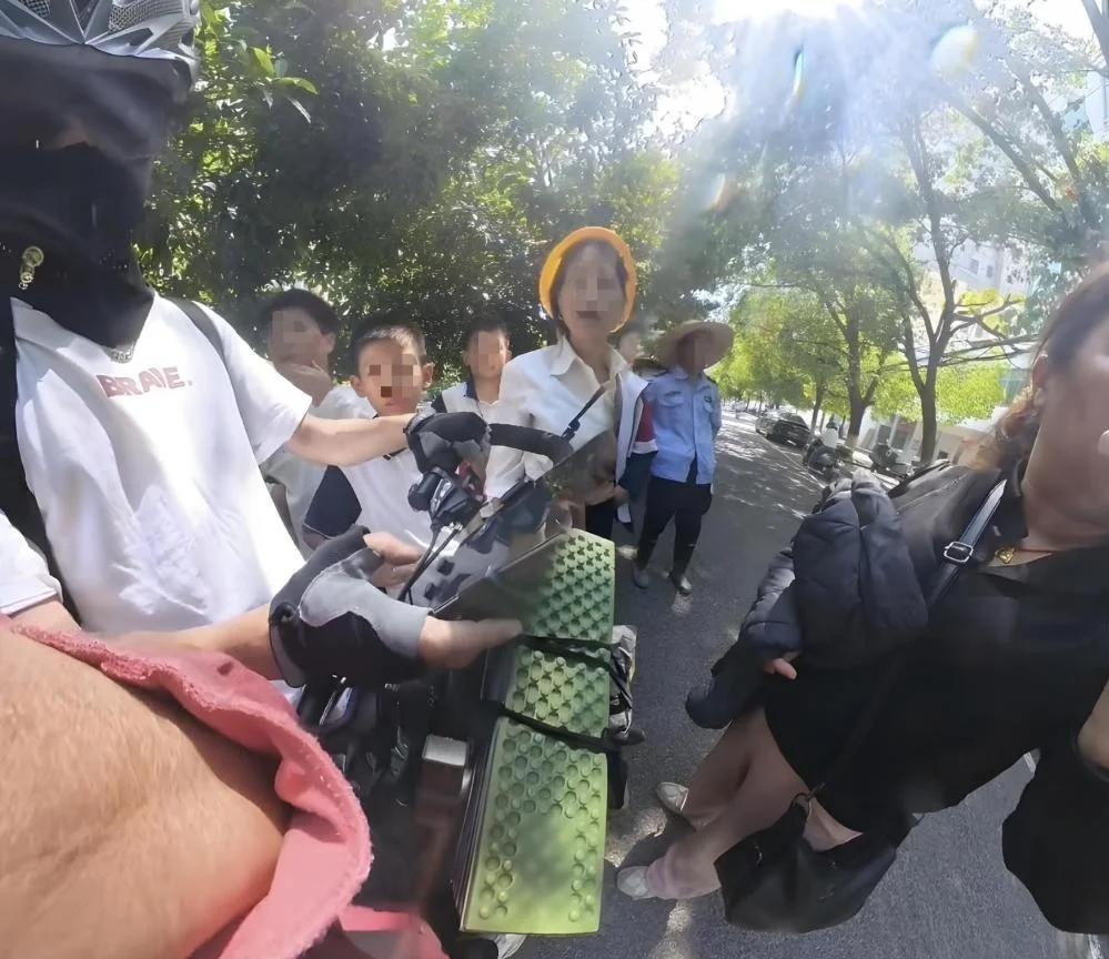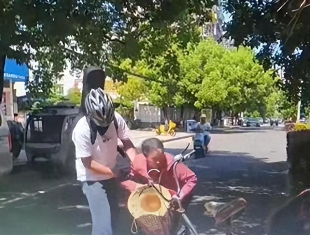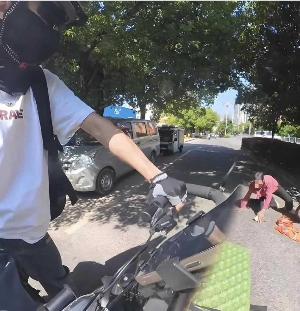 江西抚州。 小伙骑着摩托,车头支着手机拍短视频。前方大妈突然摔倒,小伙赶紧去扶,