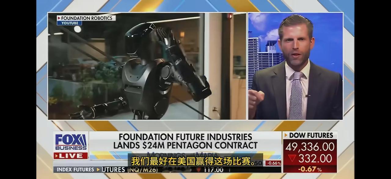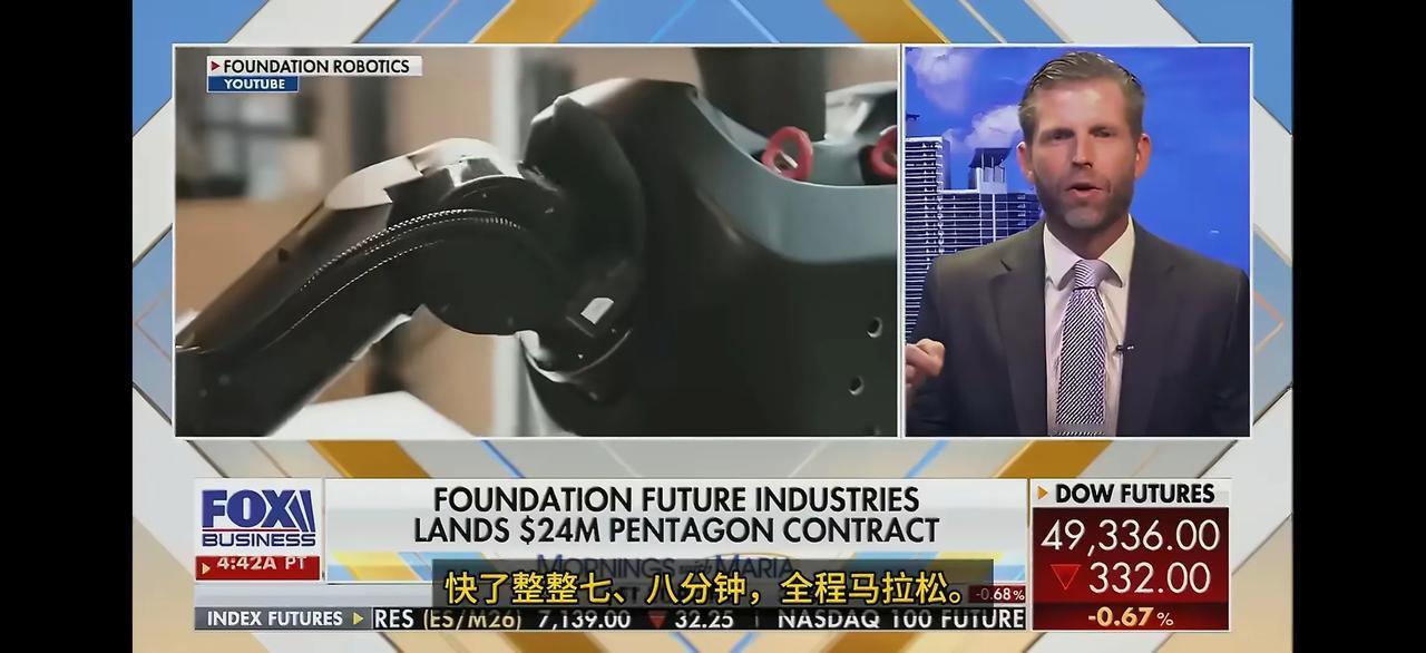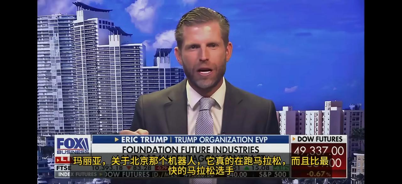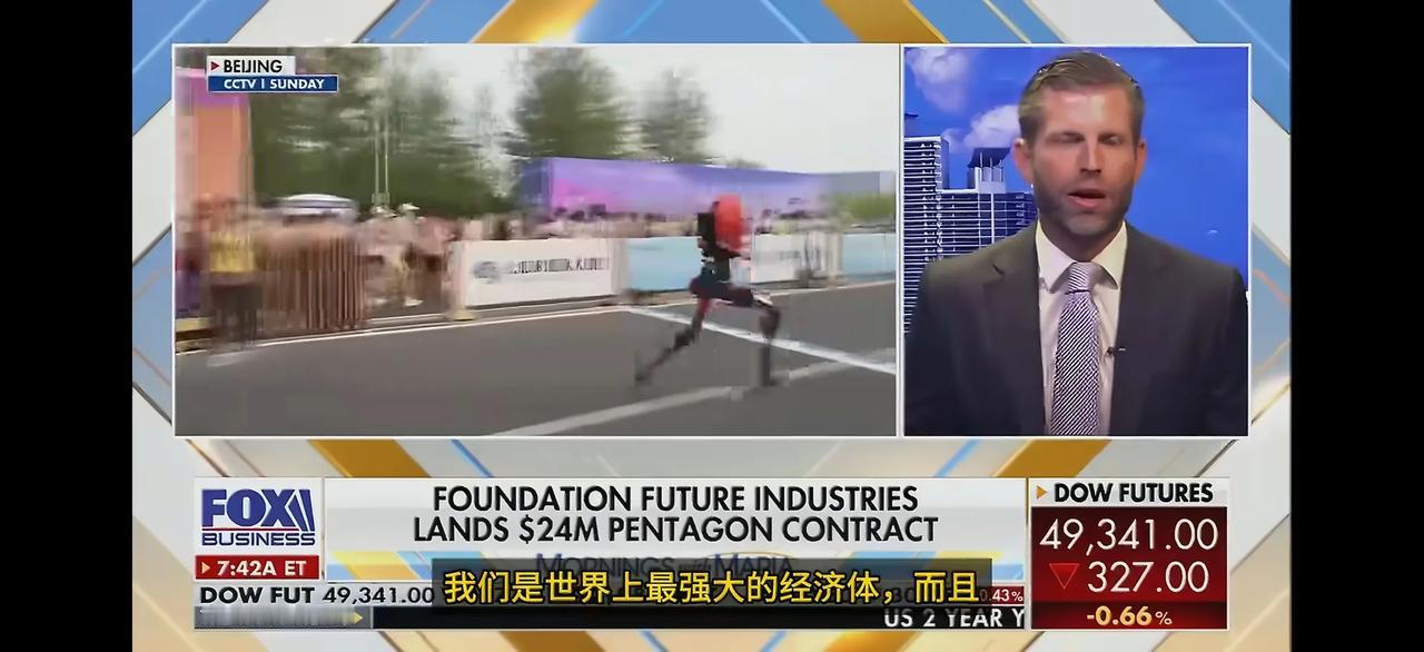 懂王的次子埃里克·特朗普在福克斯新闻玛丽亚·巴蒂罗姆的节目中谈到了北京亦庄机器人半程马拉松比赛。埃里克·特朗普说:“比最快的人类马拉松选手快了整整七、八分钟。我的意思是,你知道,这些还处于非常早期的阶段。我们最好在美国赢得这场比赛。”