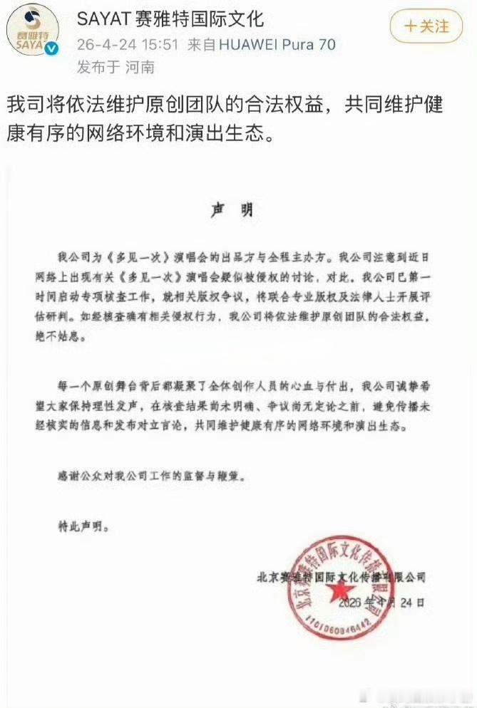 檀健次演唱会主办方声明表示将维护原创合法权益