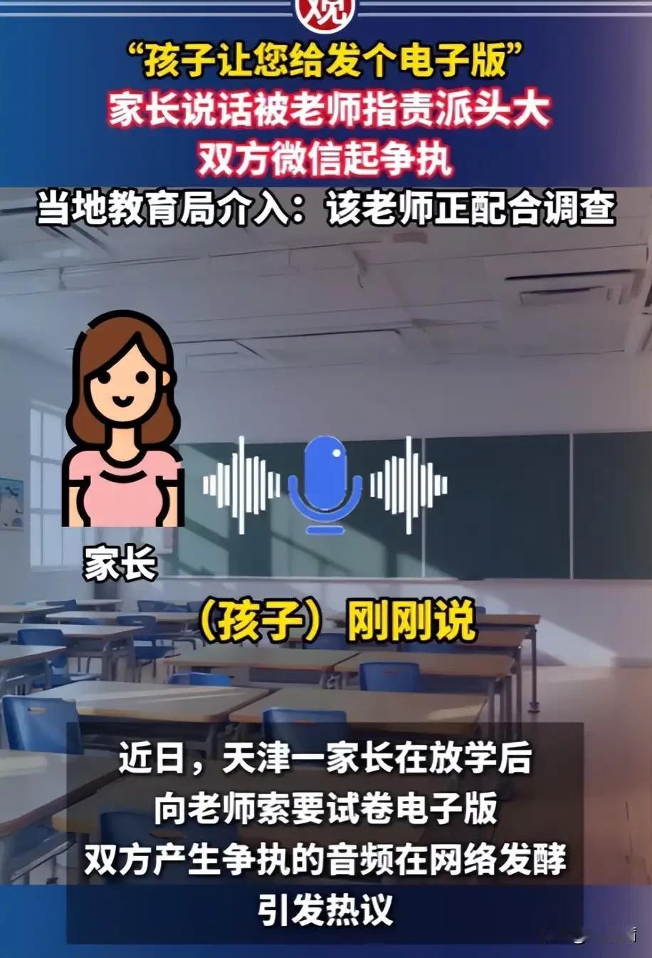 4月22日晚,天津津南区一名家长发现孩子没领到试卷,便礼貌联系老师,希望能发电子版自己打印。没想到老师当场炸毛,指责家长“派头大、没礼貌”,还强调自己已下班、没有电子版,双方争执不断升级。