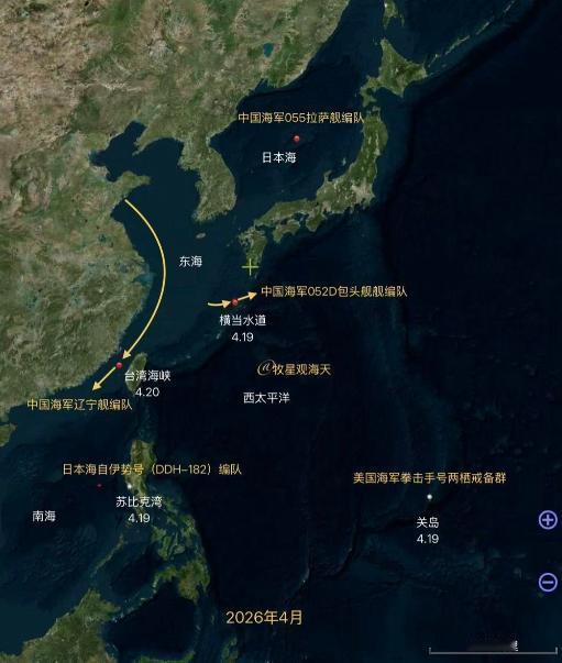 当地时间2026年4月20日,美国方面总结了,根据世界航行航线系统的数据,中国海军辽宁号航母通过台湾海峡时,美军紧急派出多架RC-135U电子侦察机和P-8A反潜机进行监视,并由两架KC-135空中加油机提供协助。从数据图来看,美军大批电子侦察舰,反潜机,加油机是从琉球群岛起飞的,这是自从美军打伊朗以后,包括停战期间,美军最新,最大在西太平洋调动航空力量,并且还是针对中国海军辽宁号航母的动向。