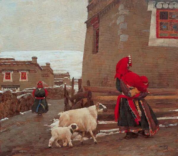 画面以冷峻的黄土色调为主,突出红色队旗,构图采用纪念碑式仰视视角,塑造了妇救会长、民兵等形象。人物面容饱经风霜、衣着破旧,眼神却坚毅果敢,将普通女性的家国情怀刻画得入木三分。构图饱满,高低错落。冷灰基调衬以红旗点睛,营造出黄土高原的凝重与悲壮,极具历史质感。