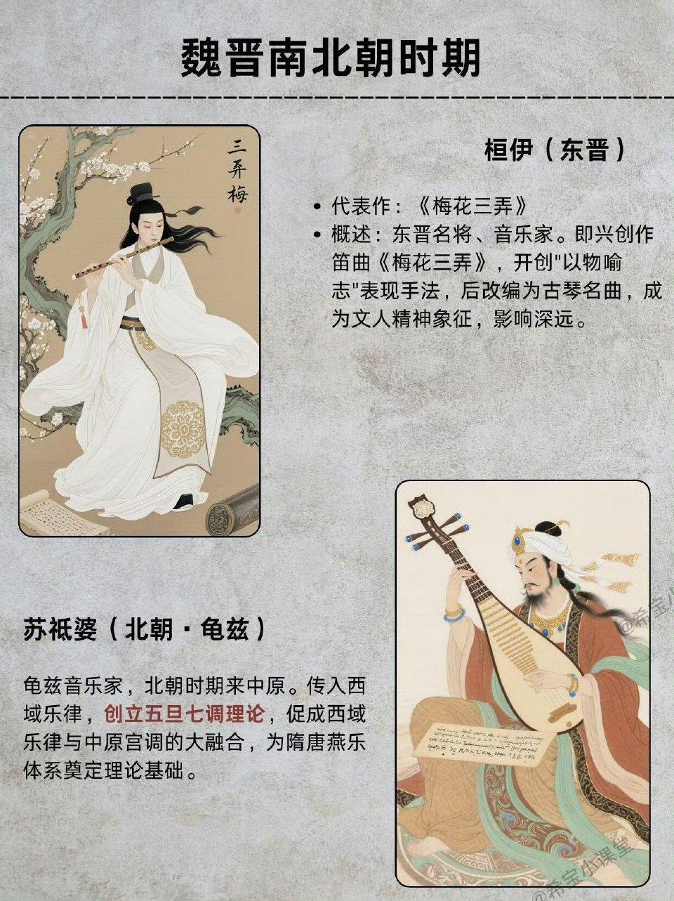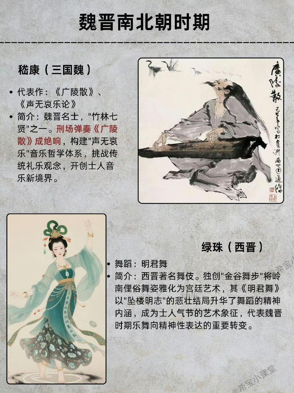 嵇康刑场奏响《广陵散》成千古绝唱,桓伊《梅花三弄》托物言志,绿珠明君舞以气节入舞,苏祗婆带来西域五旦七调,为后世乐律铺路。