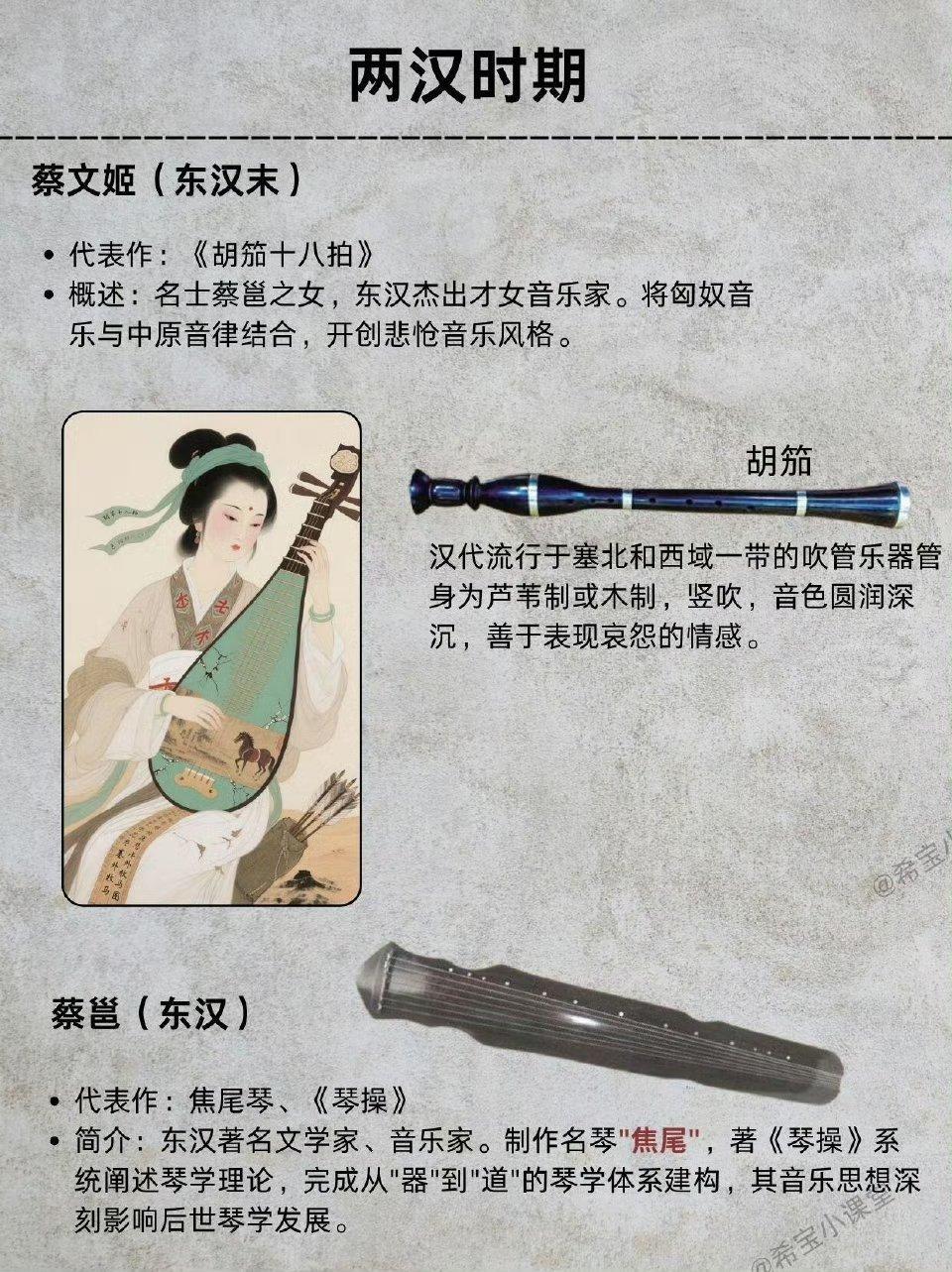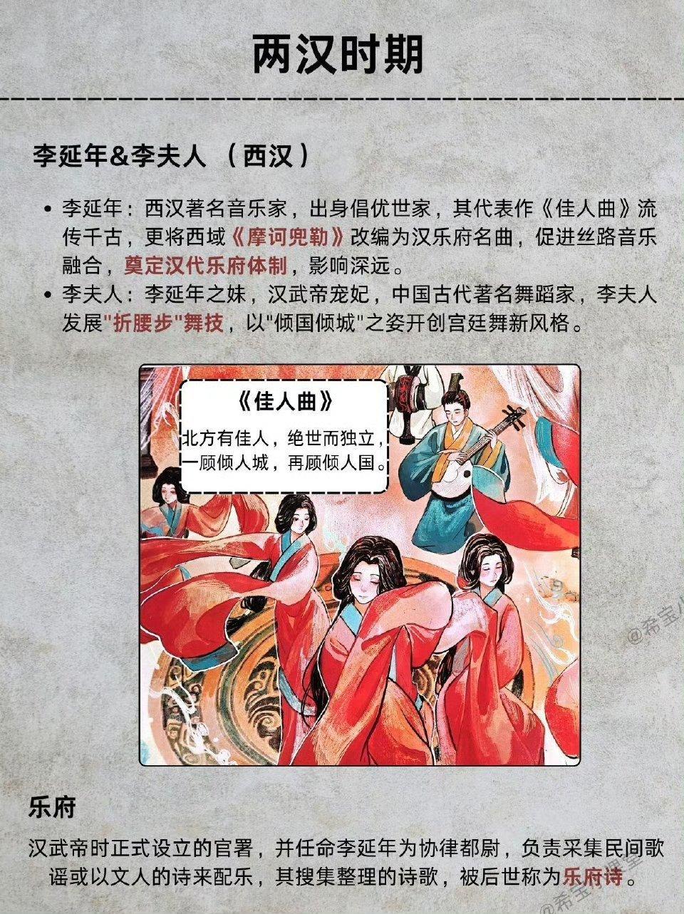 赵飞燕掌上舞轻盈绝世;蔡邕制焦尾琴、蔡文姬谱写《胡笳十八拍》;李延年一曲《佳人曲》,李夫人折腰起舞,汉乐府正式诞生,丝路乐音开始交融。