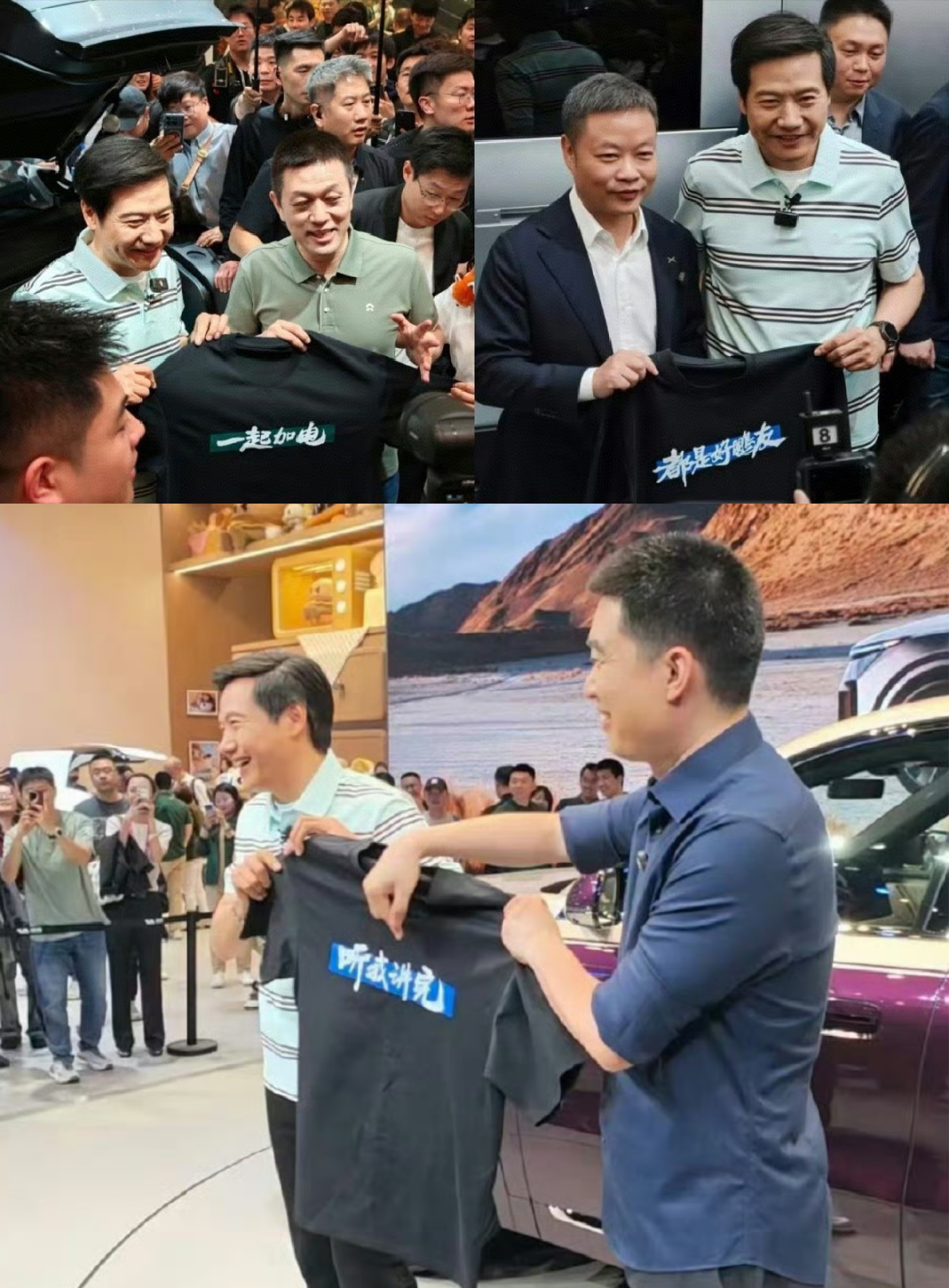 雷军太能“玩梗”了,依旧是北京车展最靓的仔,依次打卡理想、小鹏、蔚来展台的同时,分别送出“听我讲完”、“都是好鹏友”、“一起加电”的T恤,不愧是蔚小理的好大哥。此外,雷军送给王传福的定制T恤,则写着“在一起才是中国汽车”。满谈汽车