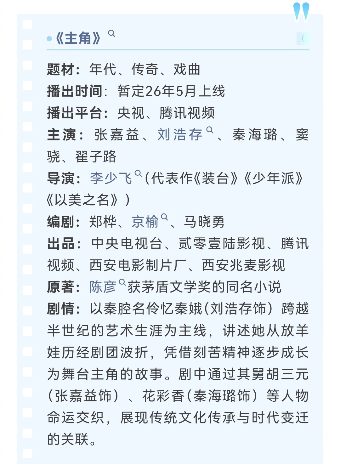 五月待播剧+1!刘浩存《主角》要来咯~秦腔名伶的半生传奇,时间跨度很大,大女主成长线。茅奖原著 + 张艺谋首次监制电视剧 + 张嘉益秦海璐一堆熟脸,这班底有点硬啊。就是不知道拍出来啥样……有出圈卖相吗?🤔