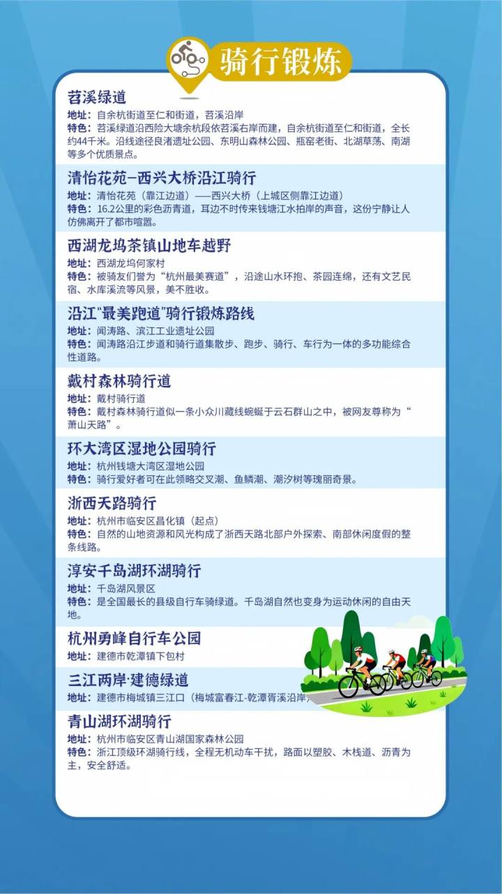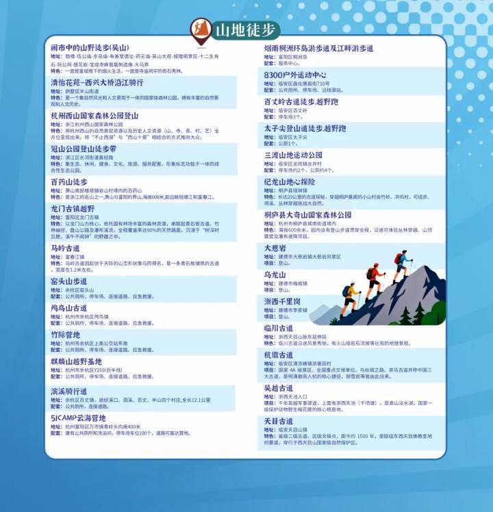 覆盖杭州13个区、县(市),汇聚百余个户外运动场景,更多样的选择。