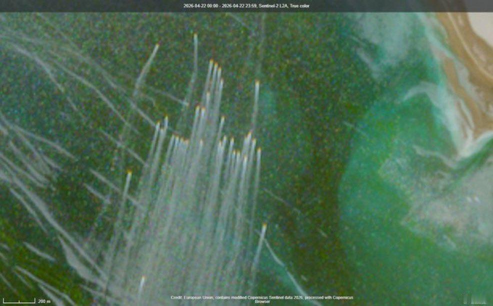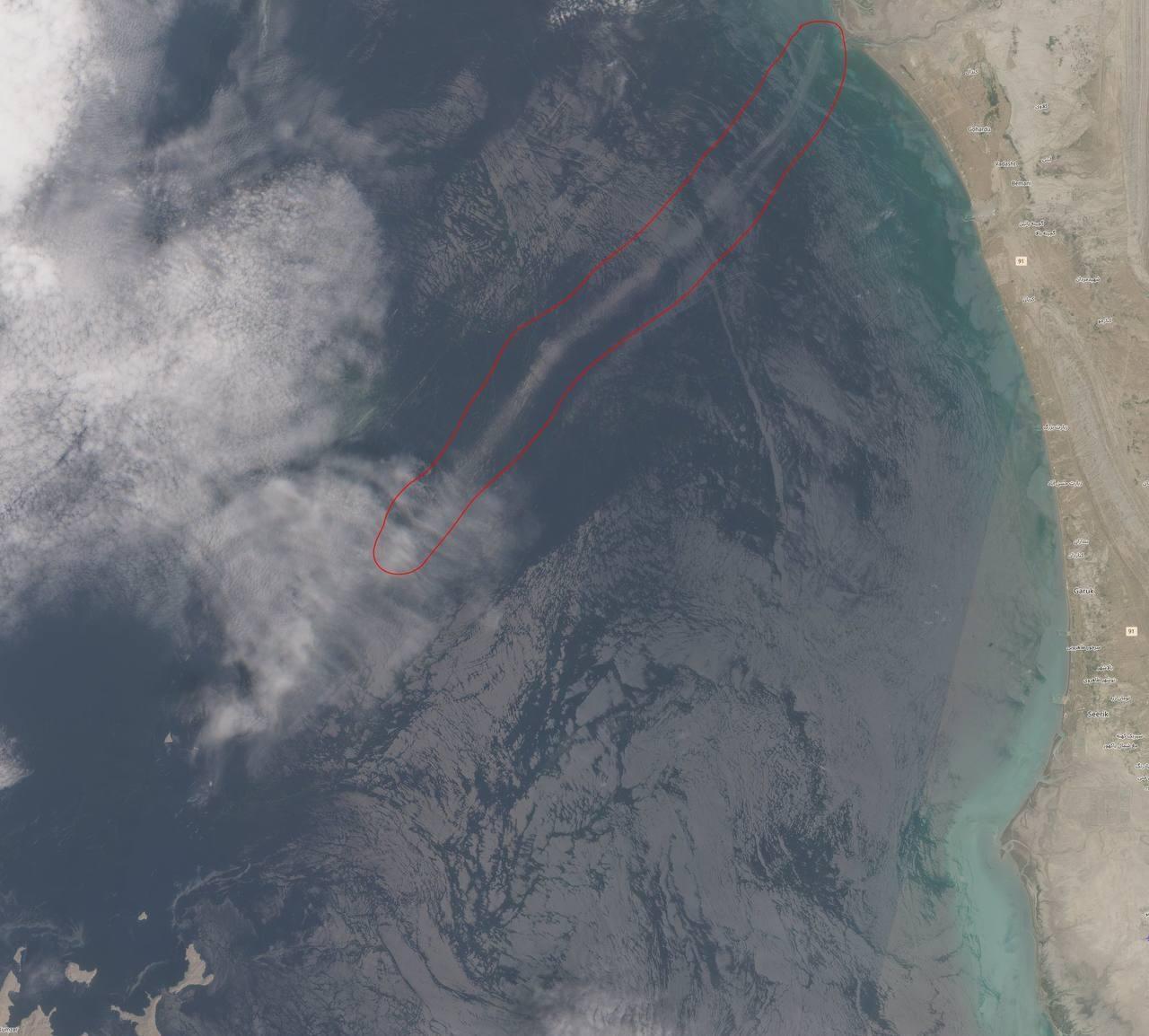 只见伊朗一支舰队,正在霍海峡最紧要的节点,由西南向东北横贯而行,在水道上留下50公里的航迹图,整个过程估计用时20-30分钟左右。(这么长时间的航迹,不排除可能是卫星连续拍摄留下的水痕)。