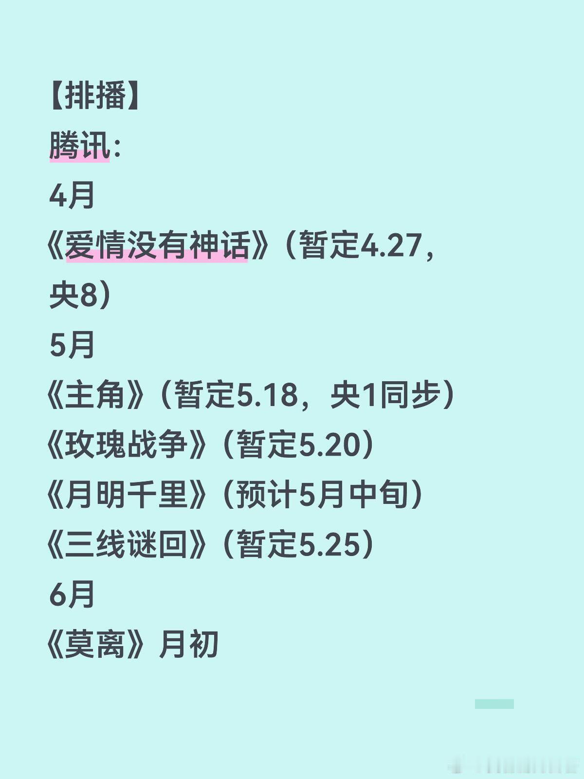 【排播】腾讯:4月《爱情没有神话》(暂定4.27,央8)5月《主角》(暂定5.18,央1同步)《玫瑰战争》(暂定5.20)《月明千里》(预计5月中旬)《三线谜回》(暂定5.25)6月《莫离》月初优酷:黑夜告白-426雨霖铃-5月底,央视备播翘楚-6月