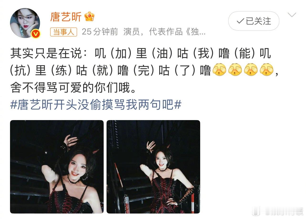 唐艺昕舍不得骂大家唐艺昕叽里咕噜的在打气 唐艺昕网感这不就有了!回应大家调侃她唱歌在干嘛,表示自己只是在给自己打气,不舍得骂大家,太可爱了