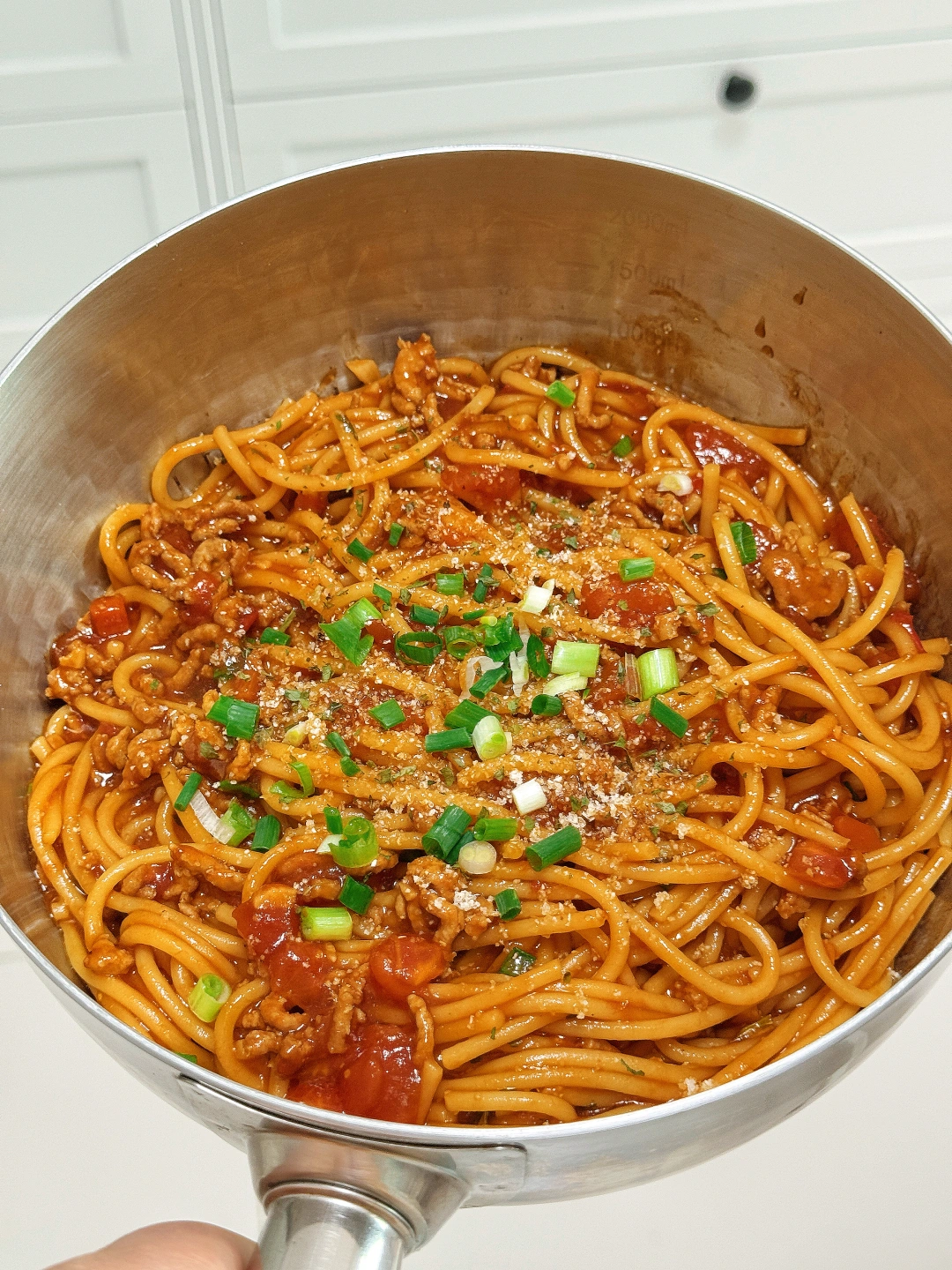 5.放入煮熟的意面,再倒入少许淀粉水,搅拌至粘稠,撒上欧芹碎和葱花即可。