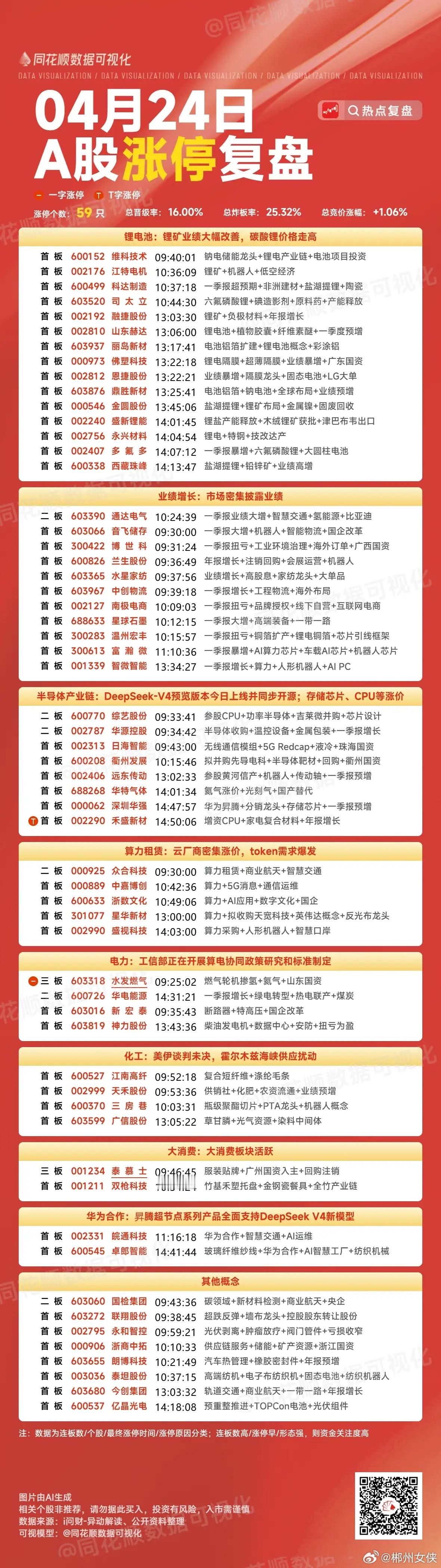 2026年4月24日 A股连板阶梯:1、三连板:水发燃气、泰慕士2、二连板:综艺股份、华电能源、华源控股、众合科技、国检集团、通达电气3、首板(20只人气股)维科技术、江特电机、科达制造、融捷股份、盛新锂能、恩捷股份、永兴材料、金圆股份、多氟多、鼎胜新材、佛塑科技、山东赫达、丽岛新材、富瀚微、华特气体、蜀道装备、深圳华强、音飞储存、兰生股份、中材科技